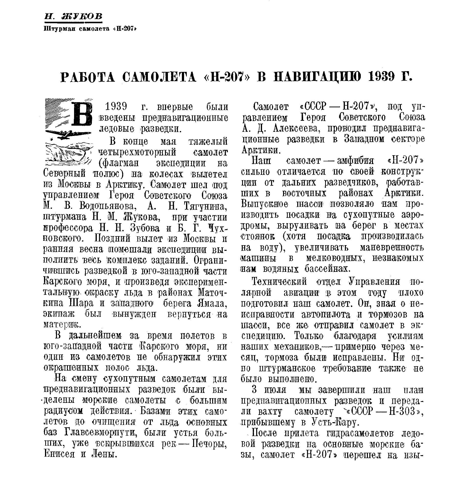 РАБОТА САМОЛЕТА «Н-207» В НАВИГАЦИЮ 1939 Г.