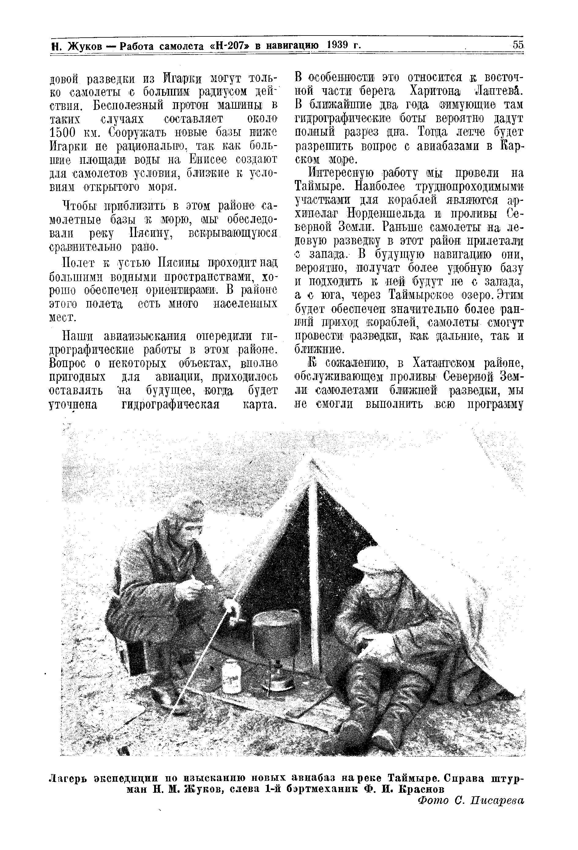 Лагерь экспедиции по изысканию новых авиабаз на реке Таймыре. Справа штурман Н. М. Жуков, слева 1-й бортмеханик Ф. И. Краснов