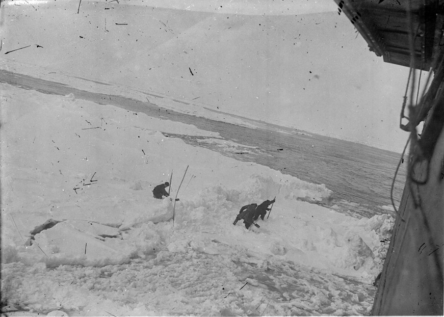 Едва в окружающих полях появляется трещина, начинается бой со льдами. Подрывники прыгают за борт, пробивают во льду