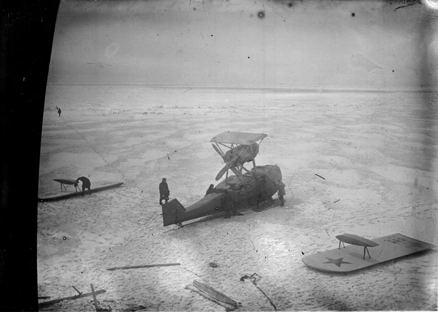 На льду выложили опознавательные знаки, суриком обвели контуры летной площадки. В открытом Беринговом море, за двести пятьдесят миль от ближайшего советского берега, возник ледовый аэродром. Наскоро собран небольшой биплан «Т-4».