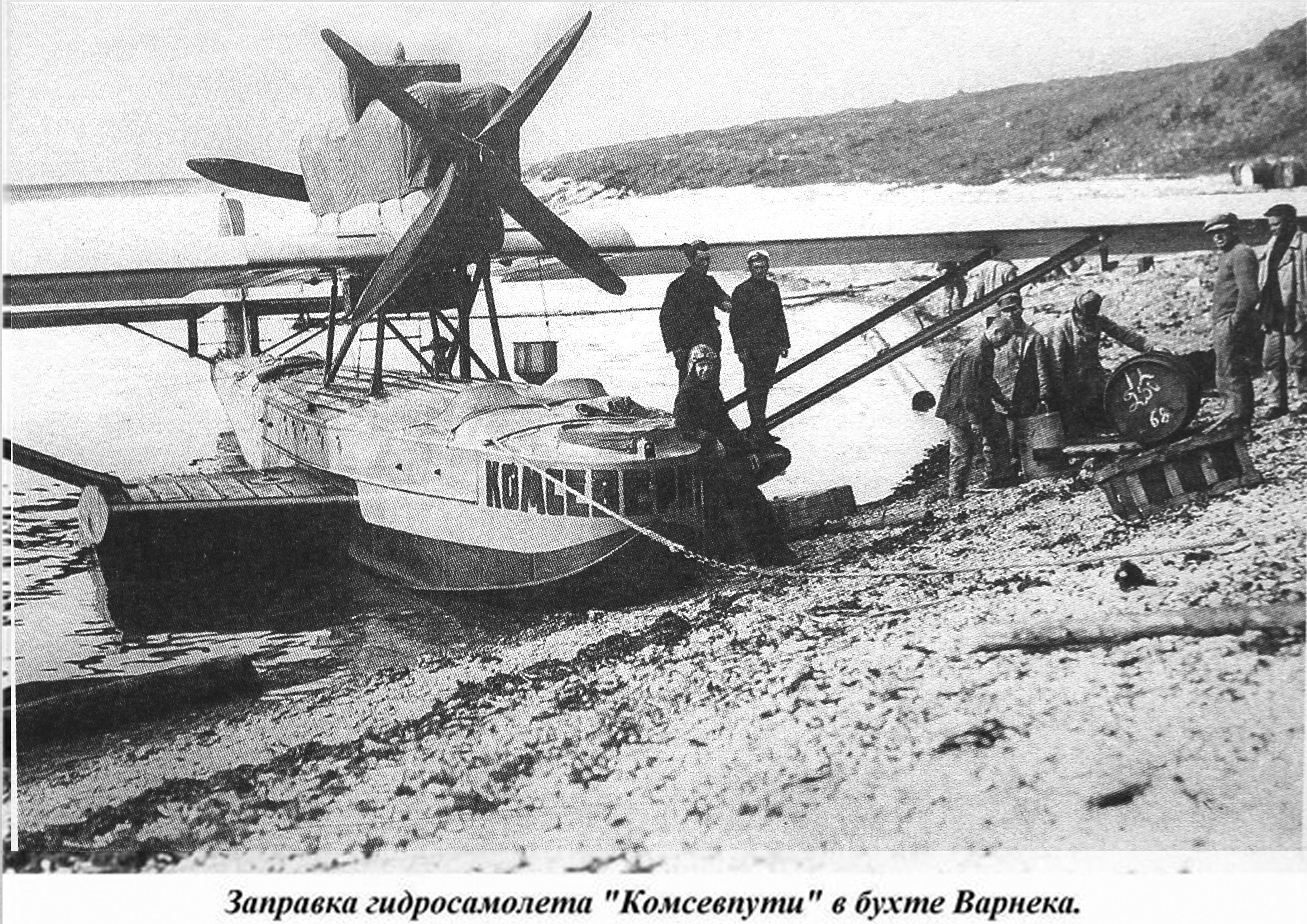 На бухте полярного острова Диксон сегодня впервые собрался весь воздушный флот Комсеверпути — три морских машины. Тов. Чухновский на днях вернулся сюда, совершив полет до Таймырского пролива. Тов. Алексеев, командир «Комсеверпути 3», стоит здесь на ледовом дежурстве для обеспечения прохода лесовозов через Карское море из портов Сибири в Европу.