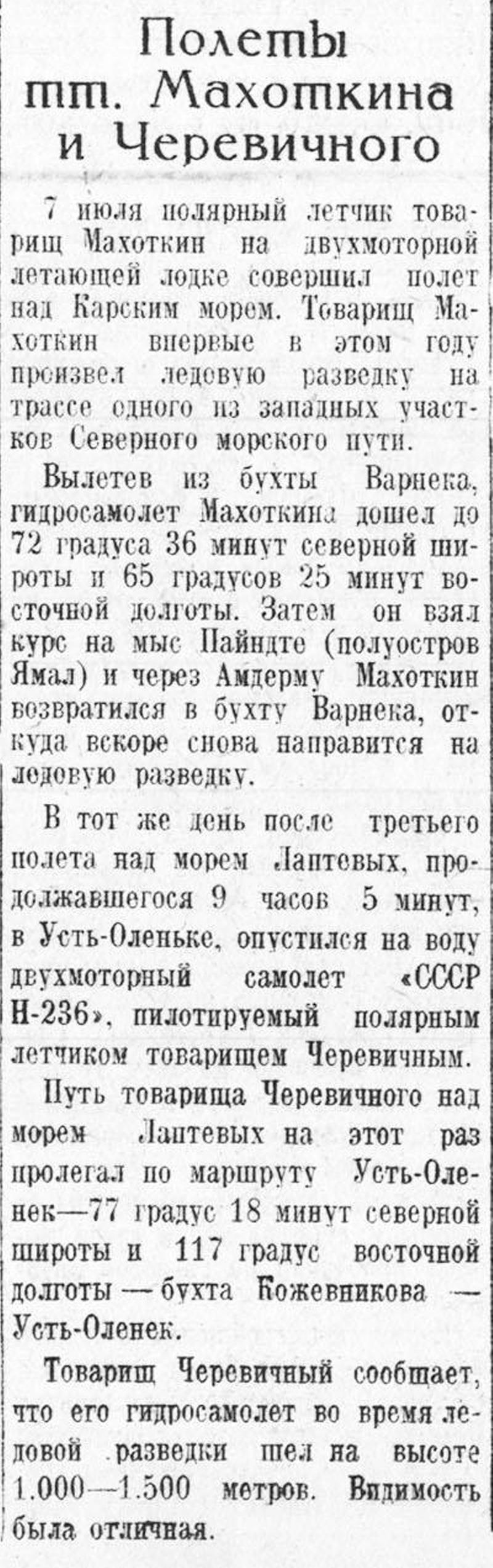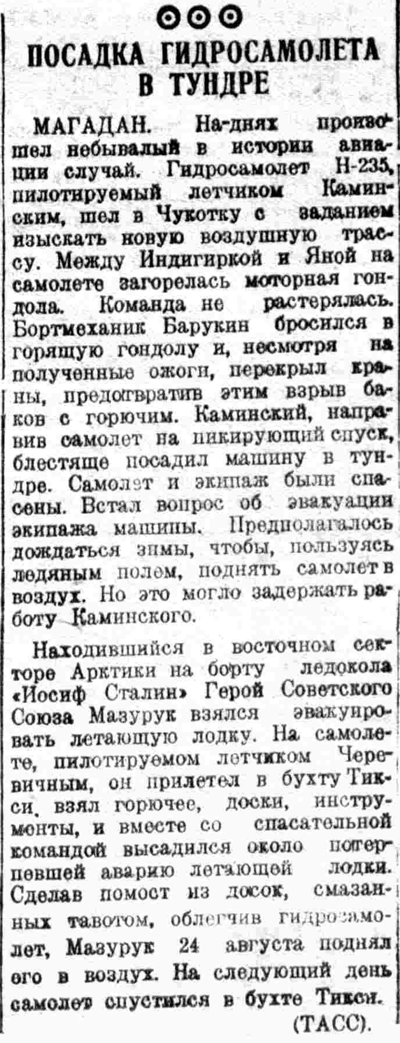 Иван Кукушкин пишет:Летом 1940 г. М. Н. Каминский совершил вынужденную посадку на своей лодке прямо в тундре, не дотянув до воды. После небольшого ремонта летчику (прим.: И. Мазуруку) удалось поднять машину в воздух, разогнав ее по смазанному маслом деревянному помосту.