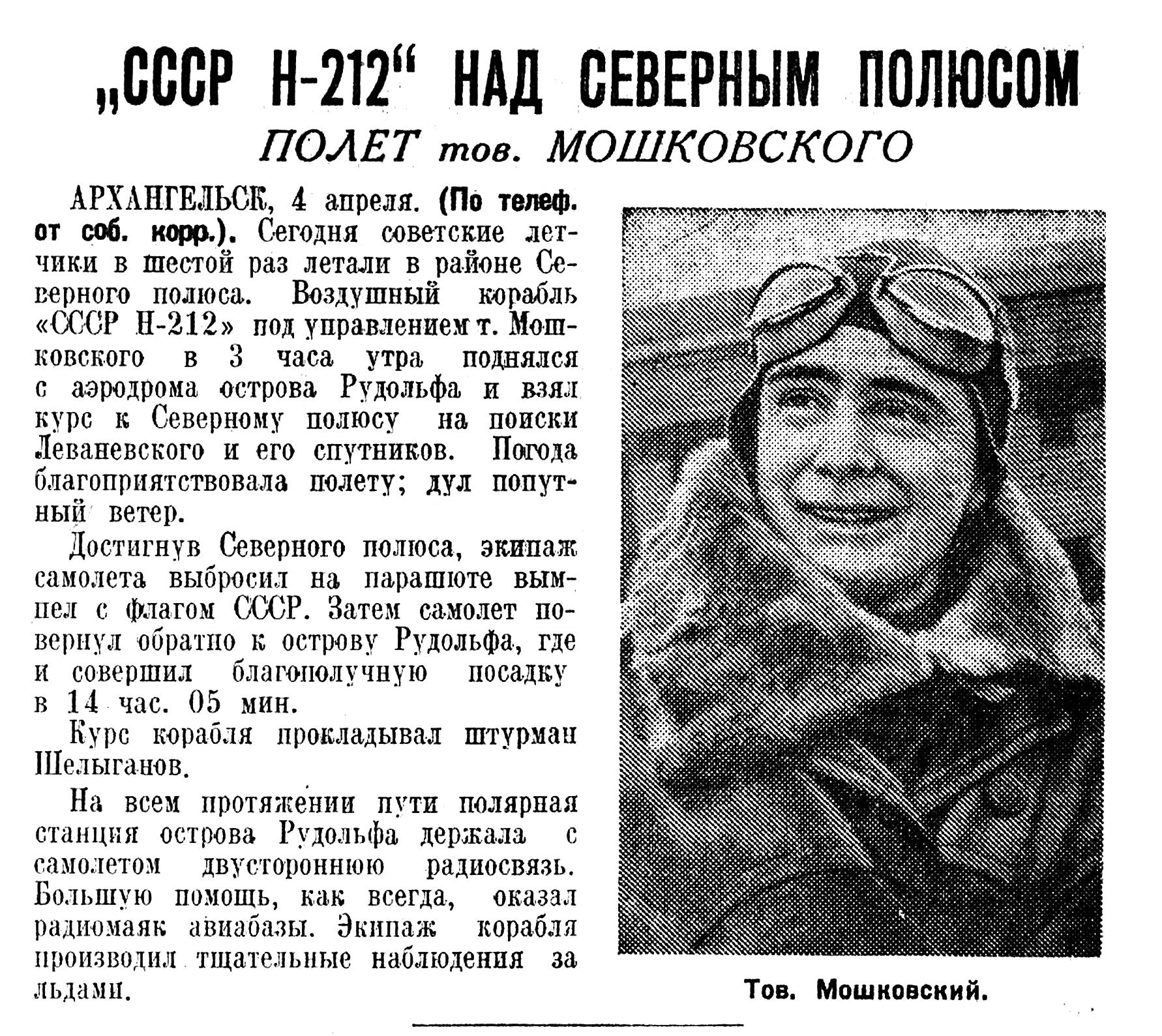 МОСКВА. 4 апреля в три часа утра самолет «Н-212», пилотируемый летчиком - орденоносцем Мошковским, вылетел с острова Рудольфа в район Северного полюса на поиски самолета Леваневского «Н-209».