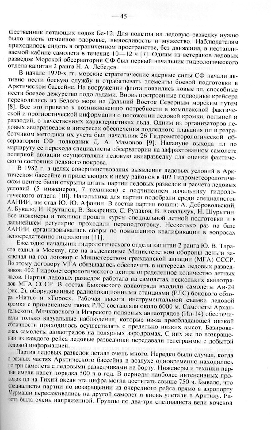 В начале 1970-х гг. морские стратегические ядерные силы СФ начали активно нести боевую службу и отрабатывать элементы боевой подготовки в Арктическом бассейне. На вооружении флота появились новые пл. способные нести боевое дежурство подо льдами. Вновь построенные подводные крейсера переводились из Белого моря на Дальний Восток Северным морским путем [8]. Все это привело к возникновению потребности в комплексной фактической и прогностической информации о положении ледовой кромки, полыней и разводий, о качественных характеристиках льда. Одним из организаторов ледовых авиаразведок в интересах обеспечения подледного плавания ил и разработчиком методики их учета был начальник 26 Гидрометеорологической обсерватории СФ полковник Д. Л. Мамонов (9). Накануне выхода пл по маршруту ее перехода специалисты обсерватории на зафрахтованном самолете полярной авиации осуществляли ледовую авиаразведку для оценки фактического состояния ледяного покрова.