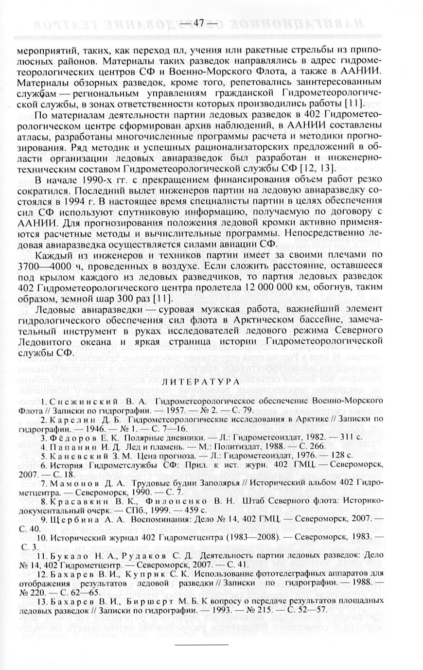 По материалам деятельности партии ледовых разведок в 402 Гидрометеорологическом центре сформирован архив наблюдений, в ААНИИ составлены атласы, разработаны многочисленные программы расчета и методики прогнозирования. Ряд методик и успешных рационализаторских предложений в области организации ледовых авиаразведок был разработан и инженерно-техническим составом Гидрометеорологической службы СФ [12, 13).