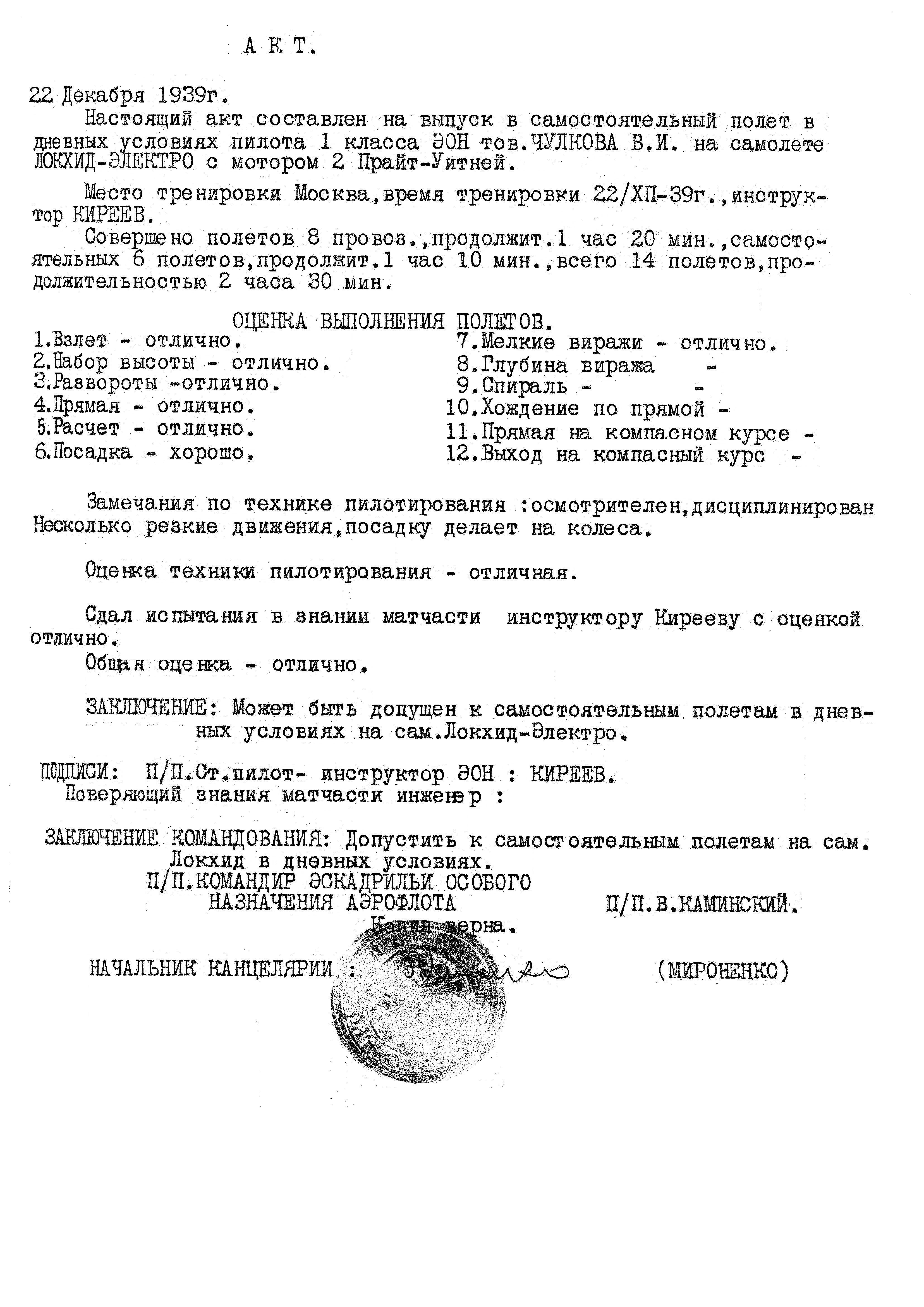Л. 156. Пр. 89. 13.6.1938г. П.1. Для проведения лётных испытаний самолётов «Консолидейтед» Н-243 и «Локхид-Электра» Н-214 назначаю Комиссию под председательством Героя Советского Союза тов. Алексеева и членов: