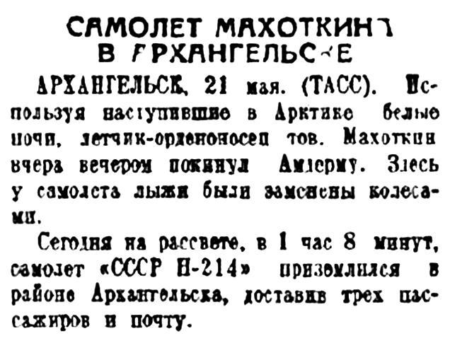 Сегодня на рассвете, в 1 час 8 минут, самолет «СССР Н-214» приземлился в районе Архангельска, доставав трех пассажиров и почту.