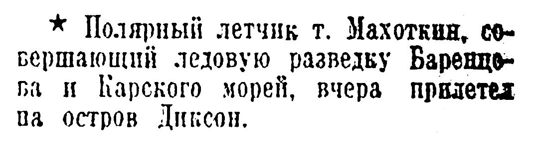Сегодня же из Красноярска на остров Диксон на самолете «СССР Н-214» вылетел полярный летчик тов. Махоткин.