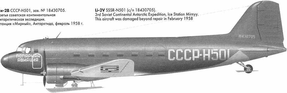 Согласно воспоминаний В.М.Перова ("От Арктики до Антарктики", с.91), самолёт Ли-2В Н-501 был потерян не в феврале, а 2 января 1958 г.: