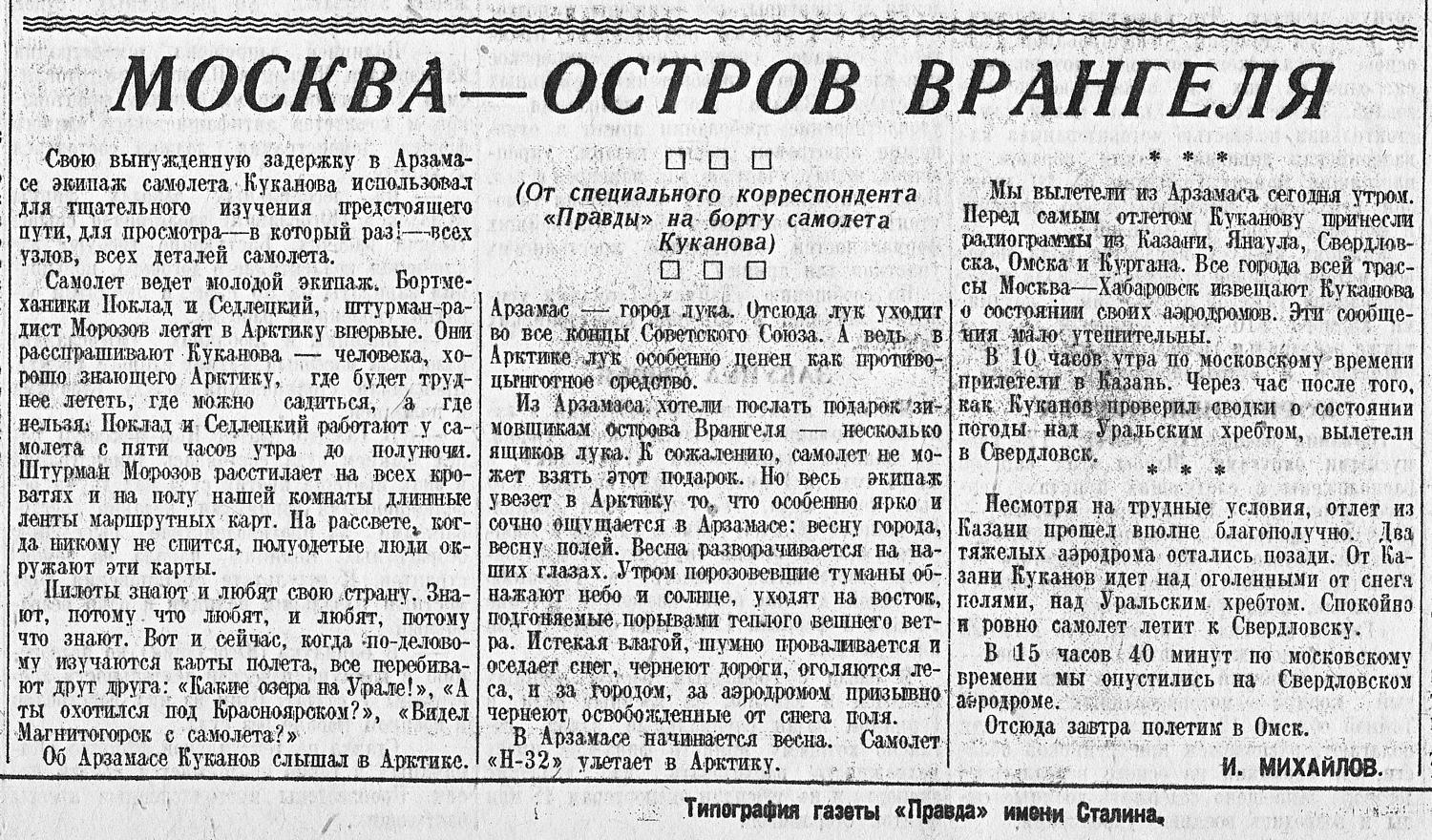 «Правда». 6 апреля 1935 г. № 95 (6341).МОСКВА — ОСТРОВ ВРАНГЕЛЯ(От специального корреспондента «Правды» на борту самолёта Куканова)