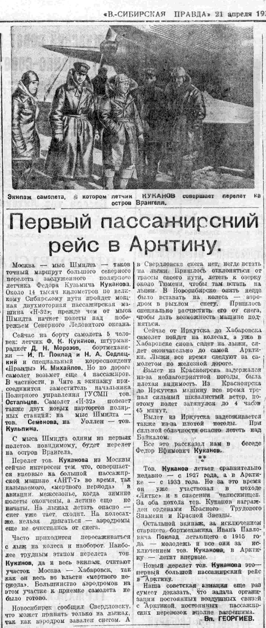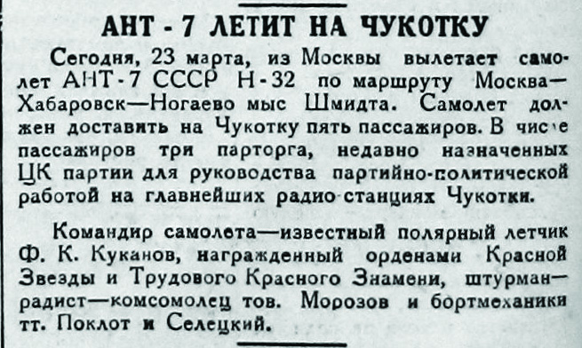 «Правда». 24 марта 1935 г. № 82 (6328).ВЫНУЖДЕННАЯ ПОСАДКА КУКАНОВА.Вчера, в 12 часов дня, с территории Московского аэропорта вылетел в большой арктический перелёт Москва — остров Врангеля лётчик Куканов. На борту самолёта — старший механик тов. Поклад, механик Седлецкий, штурман-радист Морозов и специальный корреспондент «Правды» тов. Михайлов. Перелёт совершается на двухмоторном самолёте «АНТ-7».