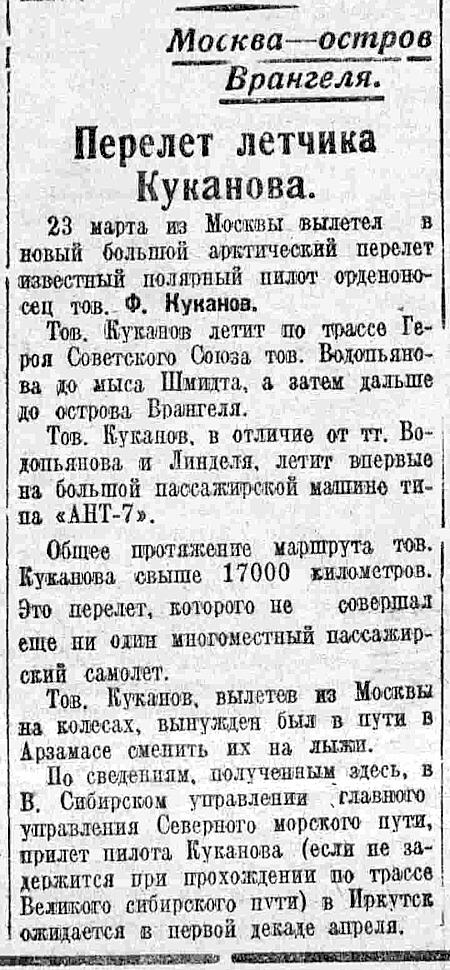 «Правда». 23 марта 1935 г. № 81 (6327).Москва — остров Врангеля.Известный лётчик Ф. К. Куканов, по заданию Главного управления Северного морского пути, начинает небывалый перелёт: от Москвы до острова Врангеля. Его маршрут проходит через всю страну с запада на восток: Москва — Казань — Свердловск — Омск — Новосибирск — Красноярск — Иркутск — Чита — Хабаровск — Николаевск-на-Амуре — Охотск — Ногаево — Гижига — Каменское — Анадырь — мыс Шмидта.