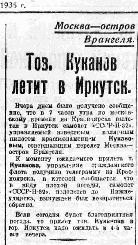 «Правда». 26 апреля 1935 г. № 115 (6361).БОЛЬШИЕ АРКТИЧЕСКИЕ ПЕРЕЛЁТЫЛётчик Куканов, совершающий перелёт Москва — остров Врангеля, вчера утром прибыл в Хабаровск.