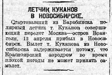 «Правда». 11 апреля 1935 г. № 100 (6346).КУКАНОВ ВЫЛЕТЕЛ В БАРАБИНСКВчера, в 8 час. 15 мин., полярный лётчик Куканов, совершающий перелёт Москва — остров Врангеля, вылетел из Тюмени на Барабинск. Куканов сменил у самолёта колёса на лыжи. (ТАСС).