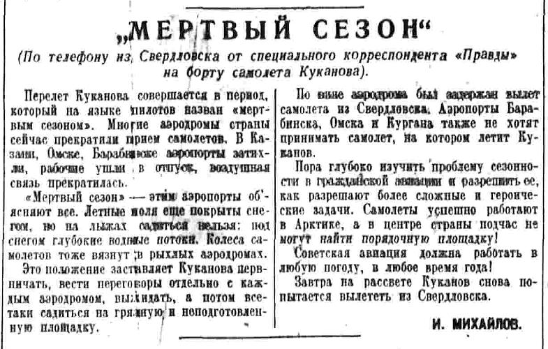 «Правда». 7 апреля 1935 г. № 96 (6342)."МЁРТВЫЙ СЕЗОН"(По телефону из Свердловска от специального корреспондента «Правды» на борту самолёта Куканова).Перелёт Куканова совершается в период, который на языке пилотов назван «мёртвым сезоном». Многие аэродромы страны сейчас прекратили приём самолётов. В Казани, Омске, Барабинске аэропорты затихли, рабочие ушли в отпуск, воздушная связь прекратилась.