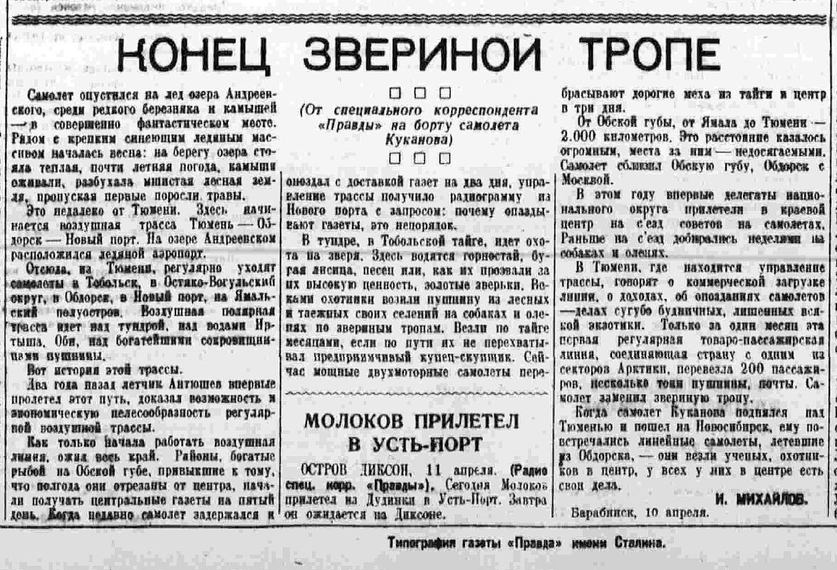Как только начала работать воздушная линия, ожил весь край. Районы, богатые рыбой на Обской губе, привыкшие к тому, что полгода они отрезаны от центра, начали получать центральные газеты на пятый день. Когда недавно самолёт задержался и опоздал с доставкой газет на два дня, управление трассы получило радиограмму из Нового порта с запросом: почему опаздывают газеты, это непорядок.