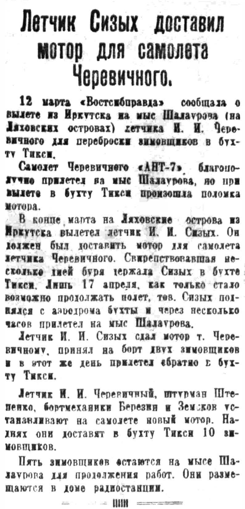 В конце марта на Ляховские острова из Иркутска вылетел летчик И. И. Сизых. Он должен был доставить мотор для самолета летчика Черевичного. Свирепствовавшая несколько дней буря держала Сизых в бухте Тикси. Лишь 17 апреля, как только стало возможно продолжать полет, тов. Сизых поднялся с аэродрома бухты и через несколько часов прилетел на мыс Шалаурова.