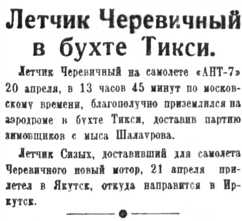 Летчик Черевичный на самолете «АНТ-7» 20 апреля, в 13 часов 45 минут по московскому времени, благополучно приземлился на аэродроме в бухте Тикси, доставив партию зимовщиков с мыса Шалаурова.