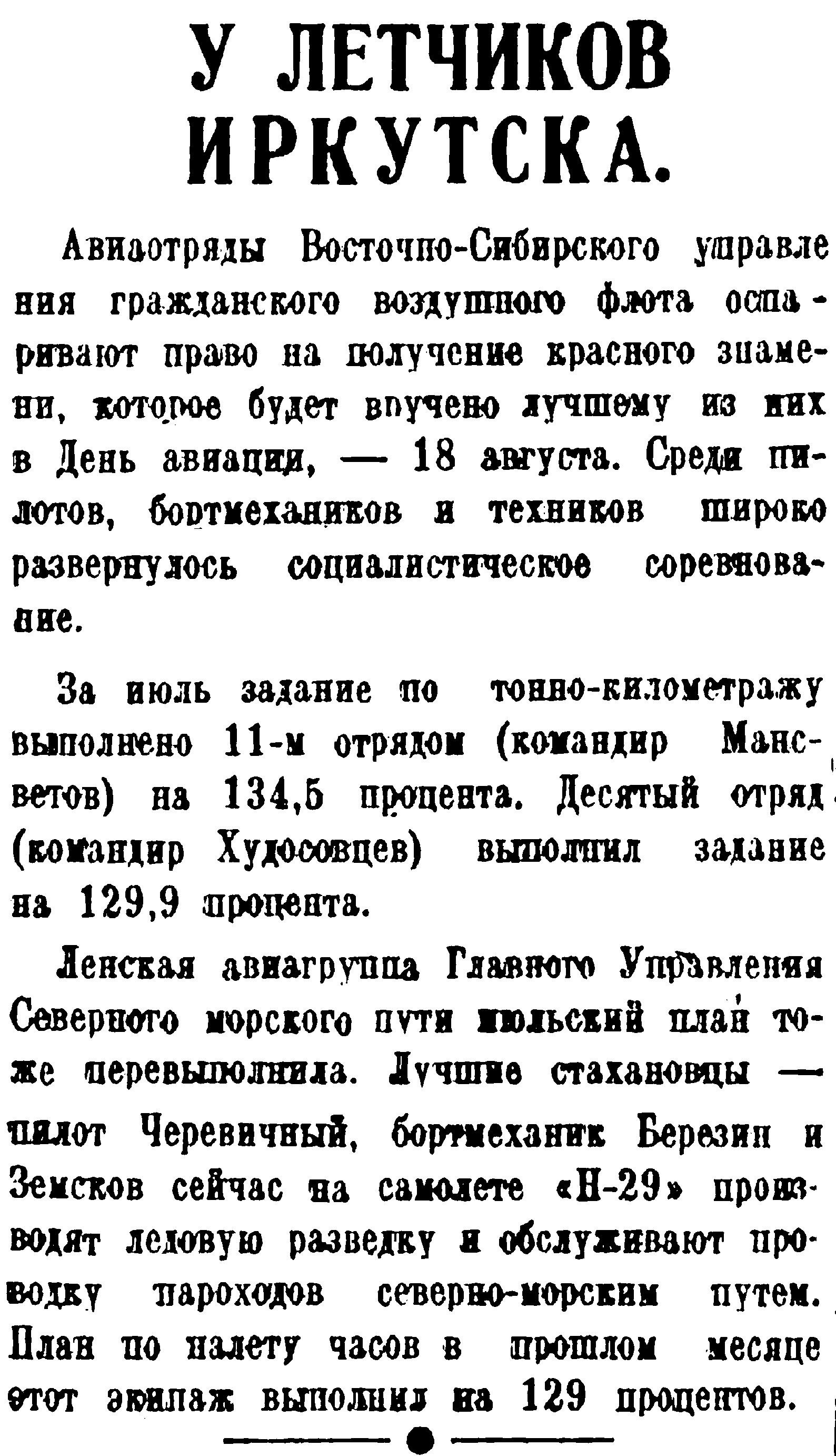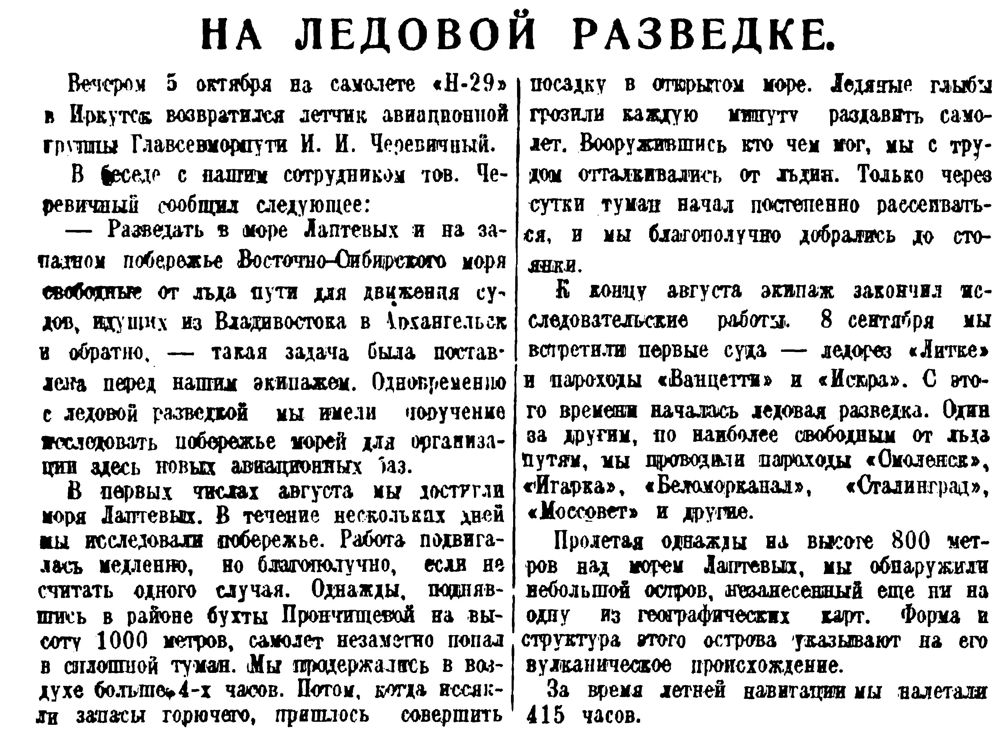 Вечером 5 октября на самолете «Н-29» в Иркутск возвратился летчик авиационной группы Главсевморпути И. И. Черевичный.