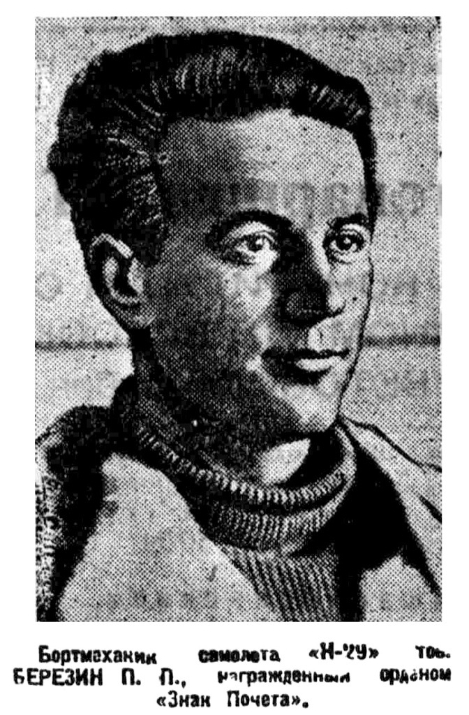 В 1909 году родился и Березин Петр Петрович, бортмеханик самолета «Н-29». Сын рабочего железнодорожника, он в 1924 году окончил семилетку. Затем работал слесарем, мотористом. В армии служил авиатехником.