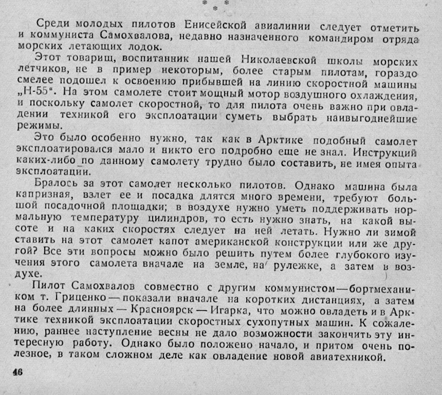 Пилот Самохвалов совместно с другим коммунистом—бортмехаником т. Гриценко — показали вначале на коротких дистанциях, а затем на более длинных—Красноярск — Игарка, что можно овладеть и в Арктике техникой эксплоатации скоростных сухопутных машин. К сожалению, раннее наступление весны не дало возможности закончить эту интересную работу. Однако было положено начало, и притом очень полезное, в таком сложном деле как овладение новой авиатехникой.