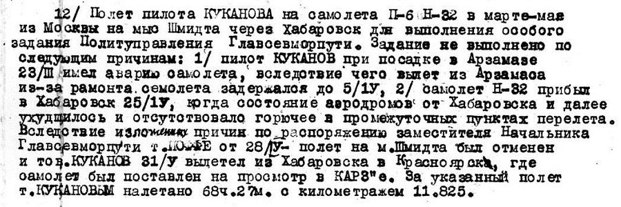12) Полёт пилота КУКАНОВА на самолёте П-6 Н-32 в марте-мае из Москвы на мыс Шмидта через Хабаровск для выполнения особого задания Политуправления Главсевморпути. Задание не выполнено по следующим причинам: 1) пилот КУКАНОВ при посадке в Арзамасе 23/III имел аварию самолёта, вследствие чего вылет из Арзамаса из-за ремонта самолёта задержался до 5/IV, 2) самолёт Н-32 прибыл в Хабаровск 25/IV, когда состояние аэродромов от Хабаровска и далее ухудшилось, и отсутствовало горючее в промежуточных пунктах перелёта. Вследствие изложенных причин по распоряжению заместителя Начальника Главсевморпути т. ИОФФЕ от 28/IV – полёт на мыс Шмидта был отменён, и тов. КУКАНОВ 31/V вылетел из Хабаровска в Красноярск, где самолёт был поставлен на просмотр в КАРЗ'е. За указанный полёт т. КУКАНОВЫМ налётано 68ч. 27м. с километражом 11,825.