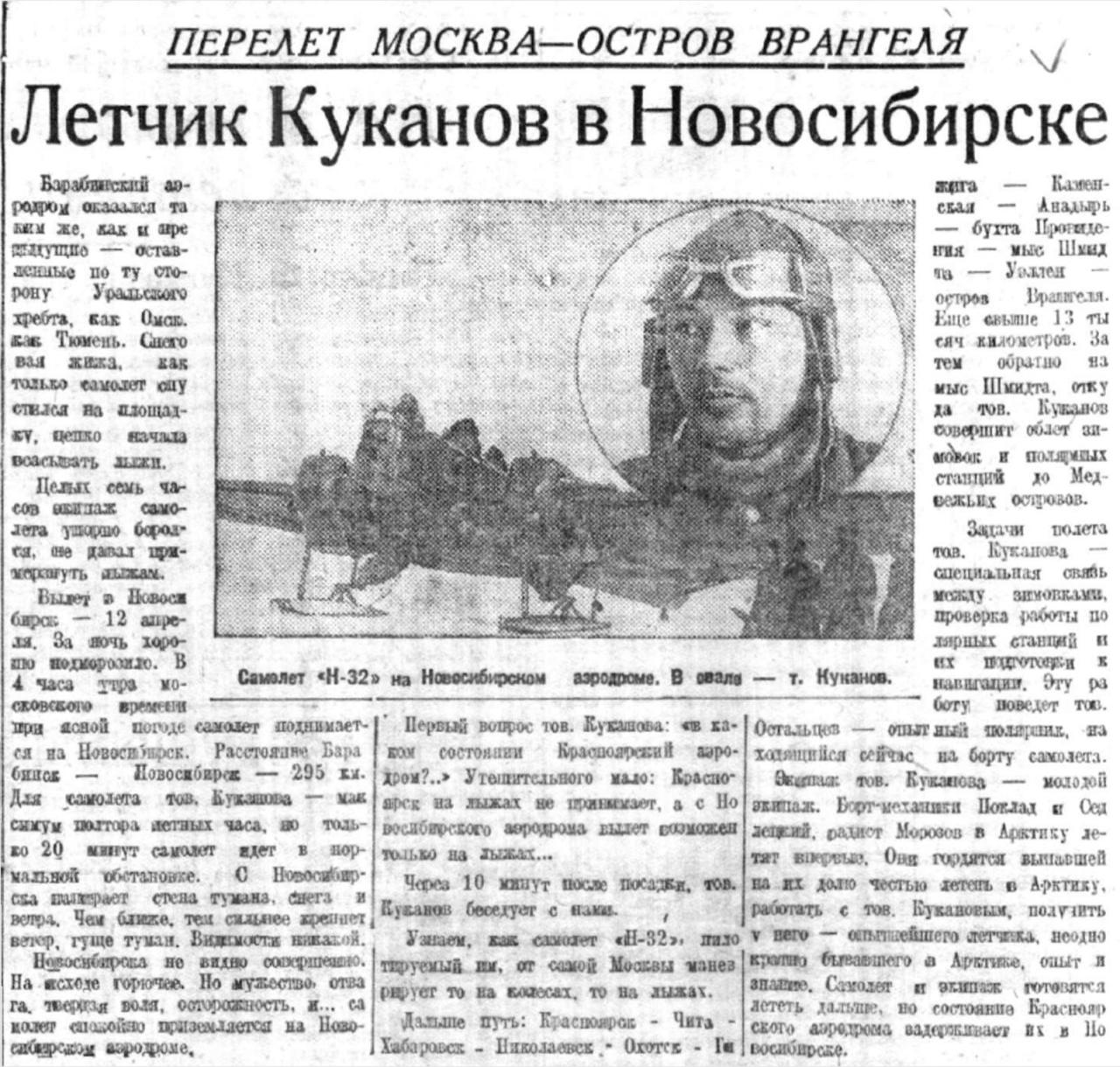 Экипаж тов. Куканова — молодой экипаж. Борт-механики Поклад и Седлецкий, радист Морозов в Арктику летят впервые. Они гордятся выпавшей на их долю честью лететь в Арктику, работать с тов. Кукановым, получить у него — опытнейшего летчика, неоднократно бывавшего в Арктике, опыт и знание. Самолет и экипаж готовятся лететь дальше, но состояние Красноярского аэродрома задерживает их в Новосибирске.
