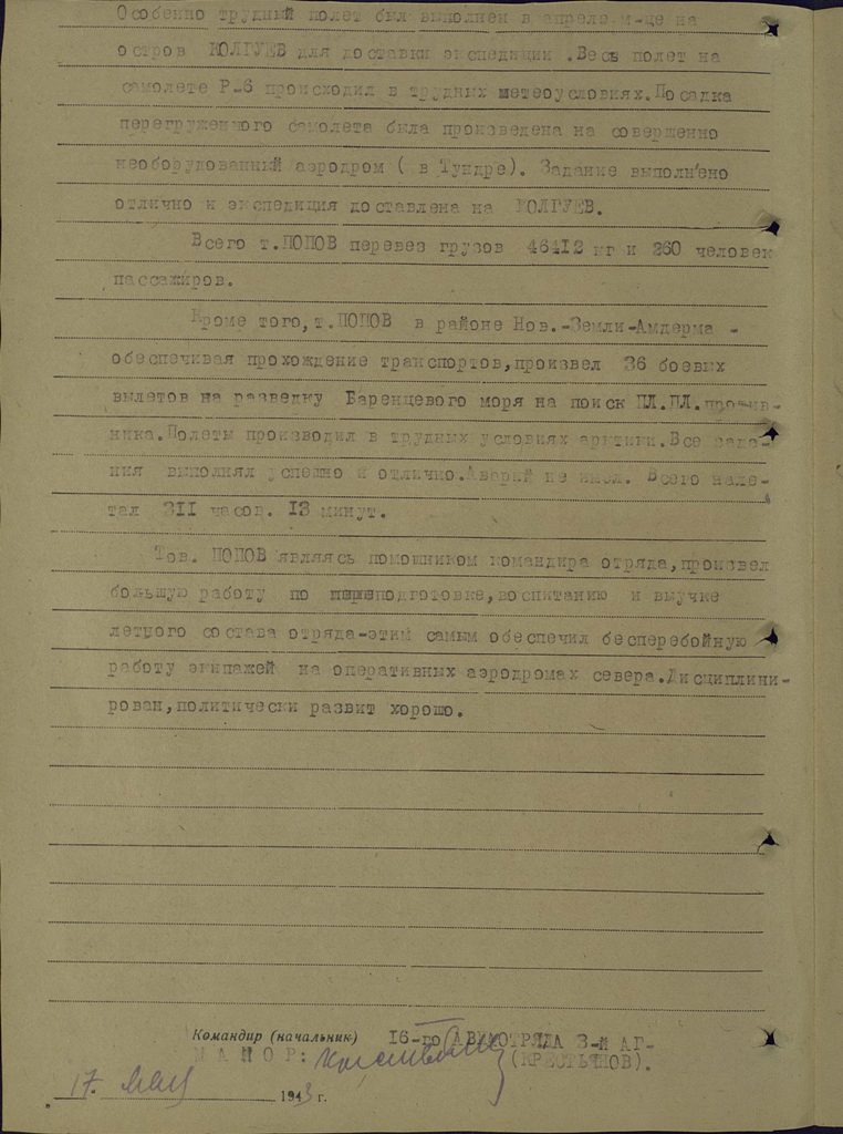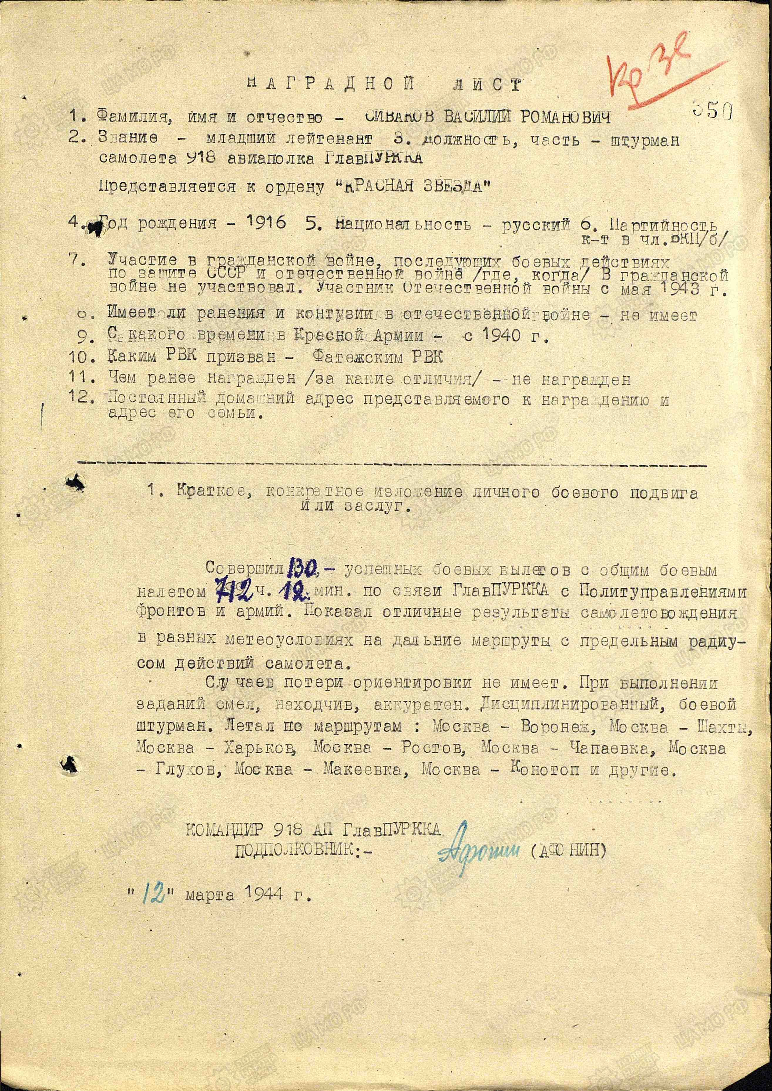 2. Штурман Сиваков Василий Романович - на март 1948 г. - "общий налёт около 1300 часов, из них ночью 10 часов, инициативный, находчивый, аккуратный работник; случаев потери ориентировки не имел".