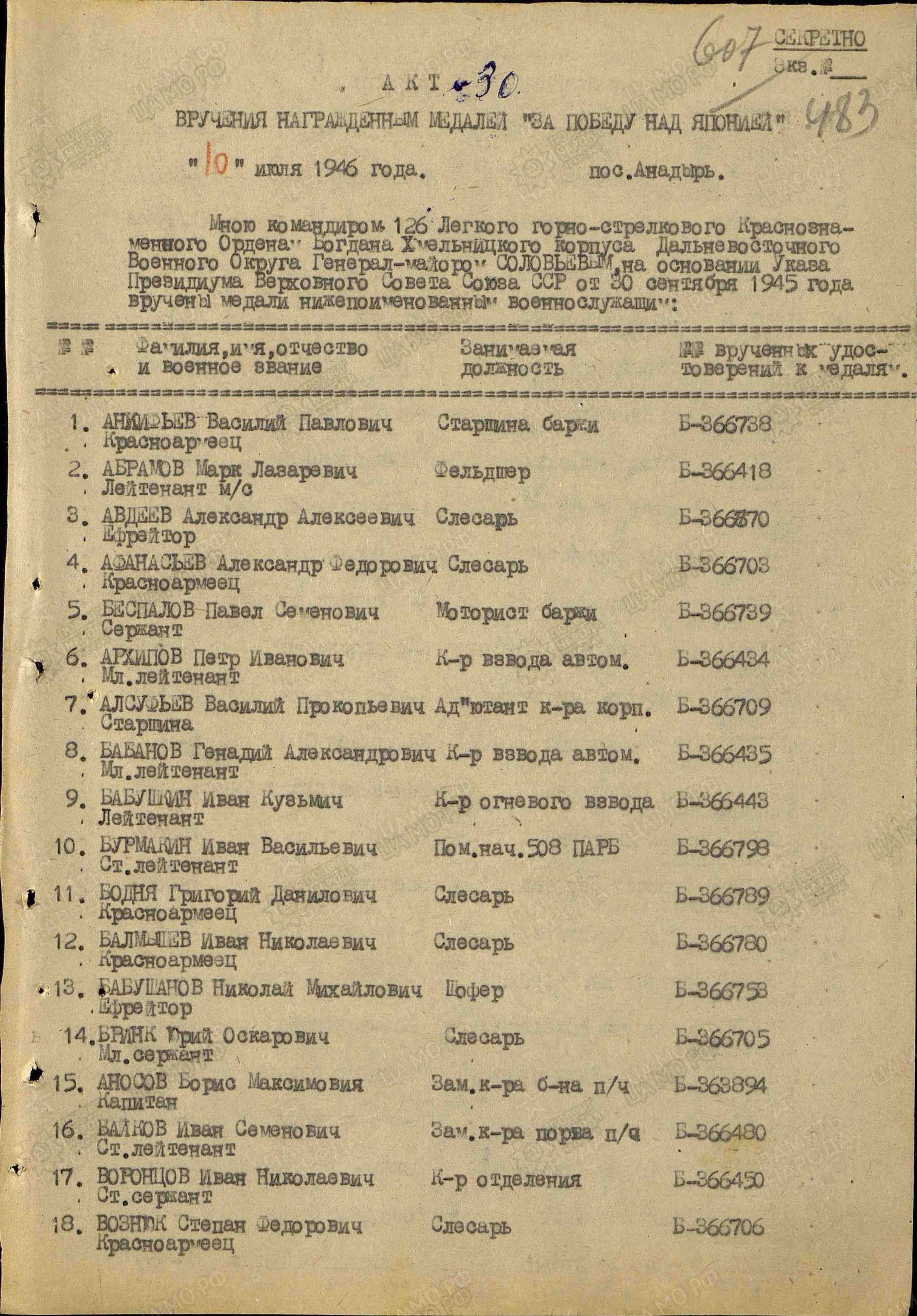 Акт от 10.07.1946 г. №: 30; Издан Управлением 126-го лёгкого горнострелкового Краснознамённого ордена Богдана Хмельницкого корпуса Дальневосточного военного округа (лгск ДВО)// ЦАМО РФ. Ф. 1018. Оп. 2. Ед.хр. 18б. № записи 1536683693