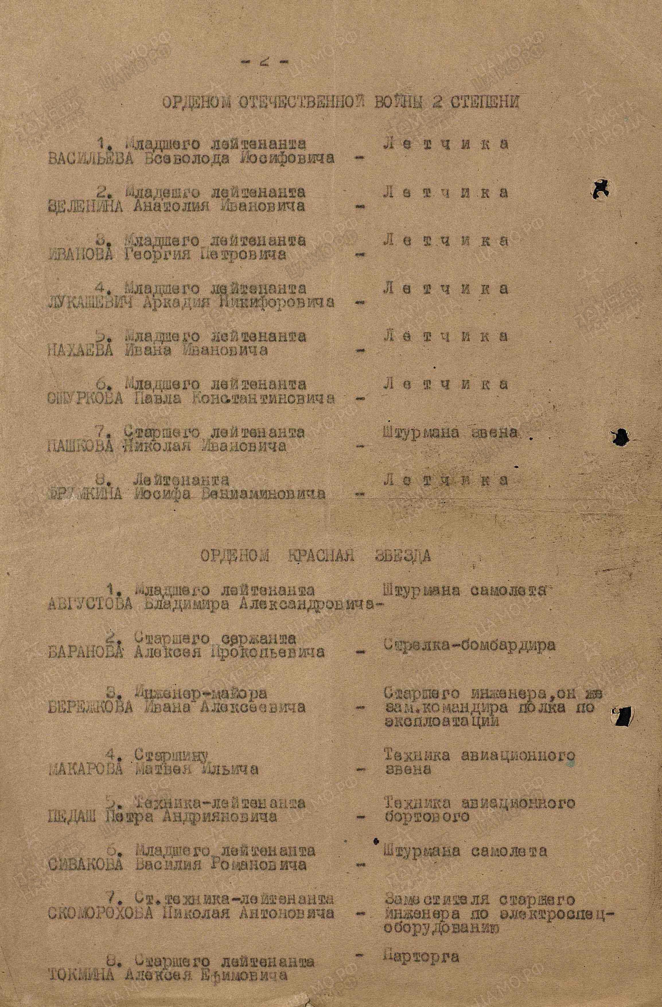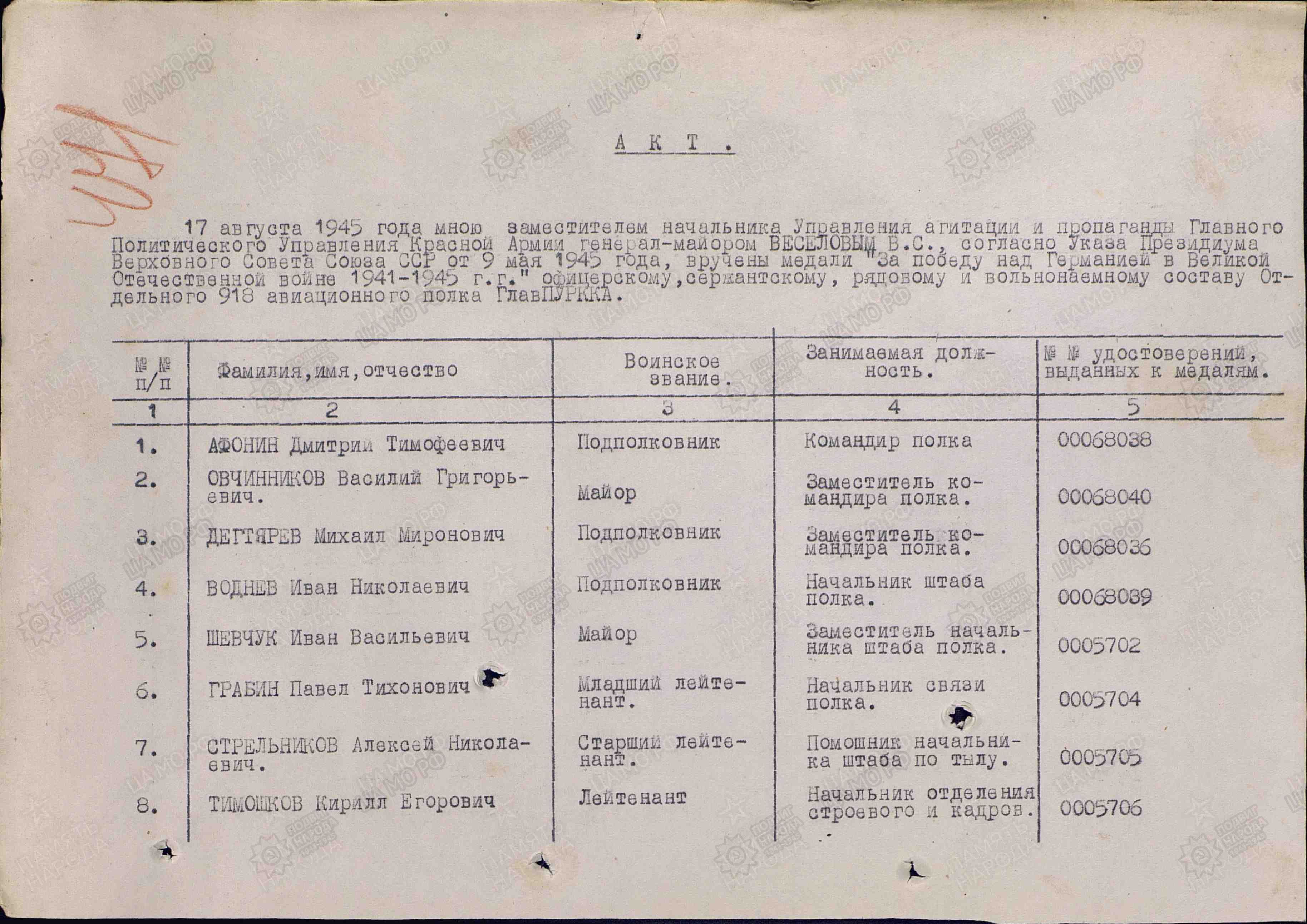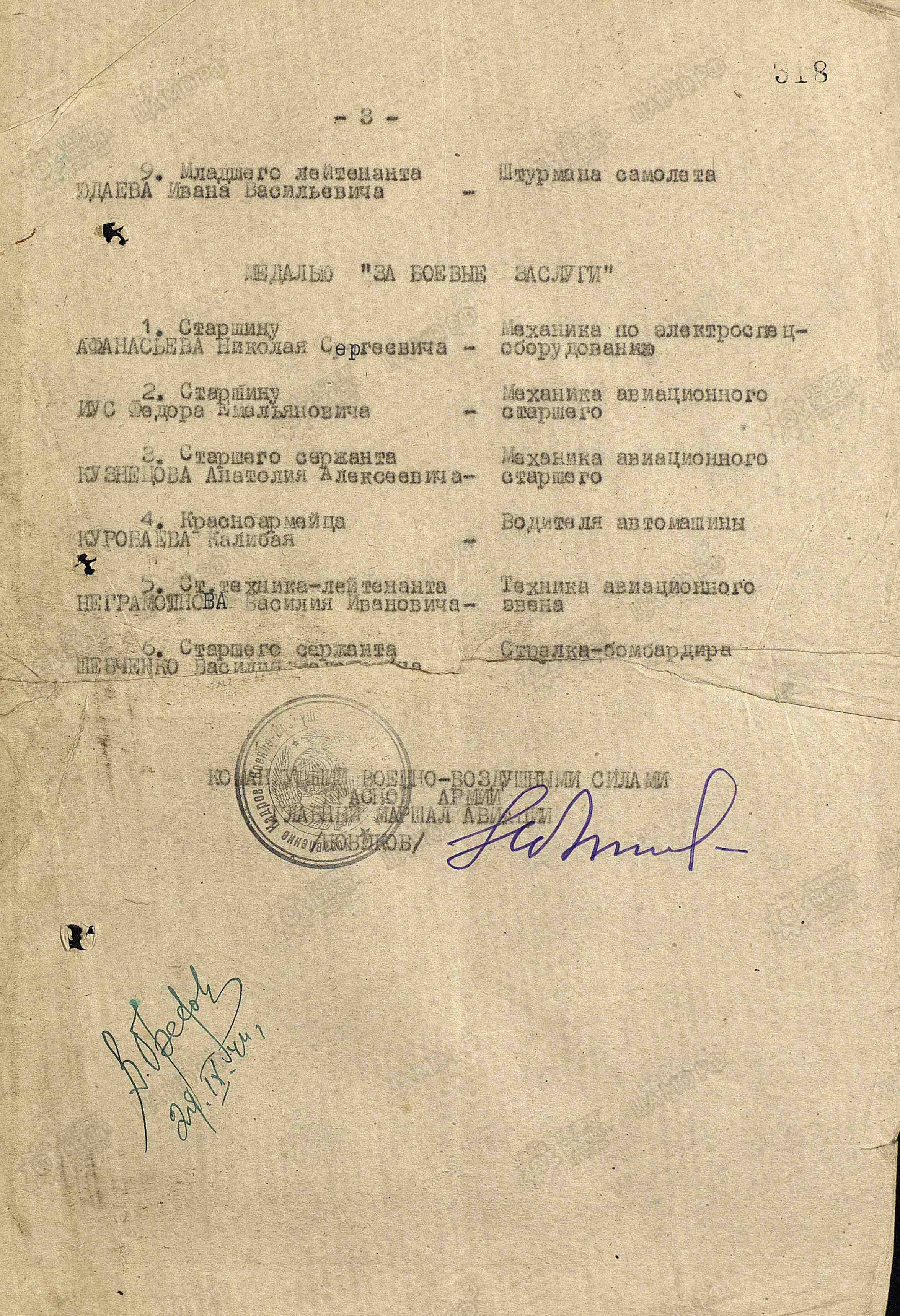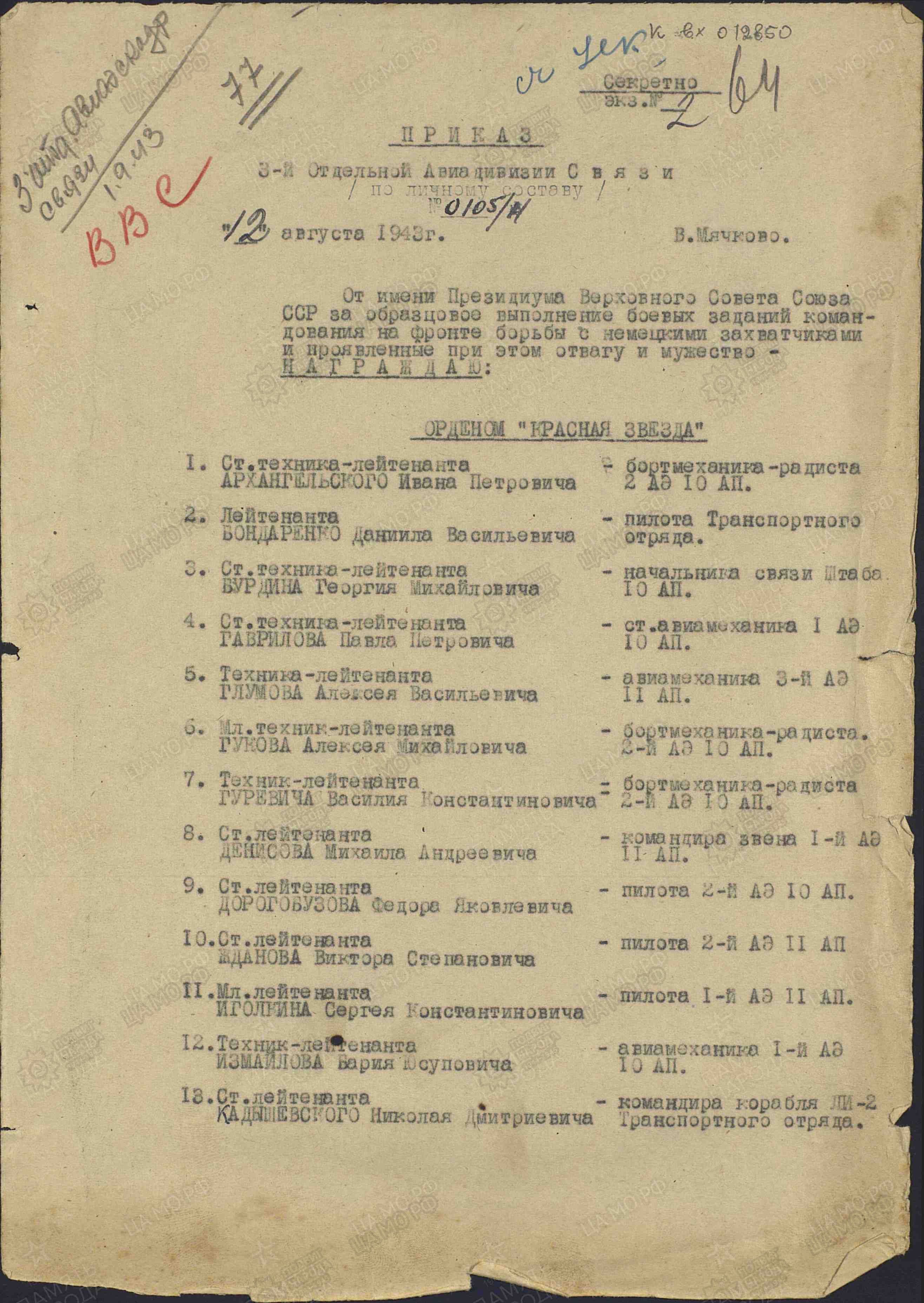 Приказ подразделения от 12.08.1943 г. №: 105/н. Издан 3 оавдс// ЦАМО РФ. Ф. 33. Оп. 682526. Ед. хр. 1329. № записи 17391585.