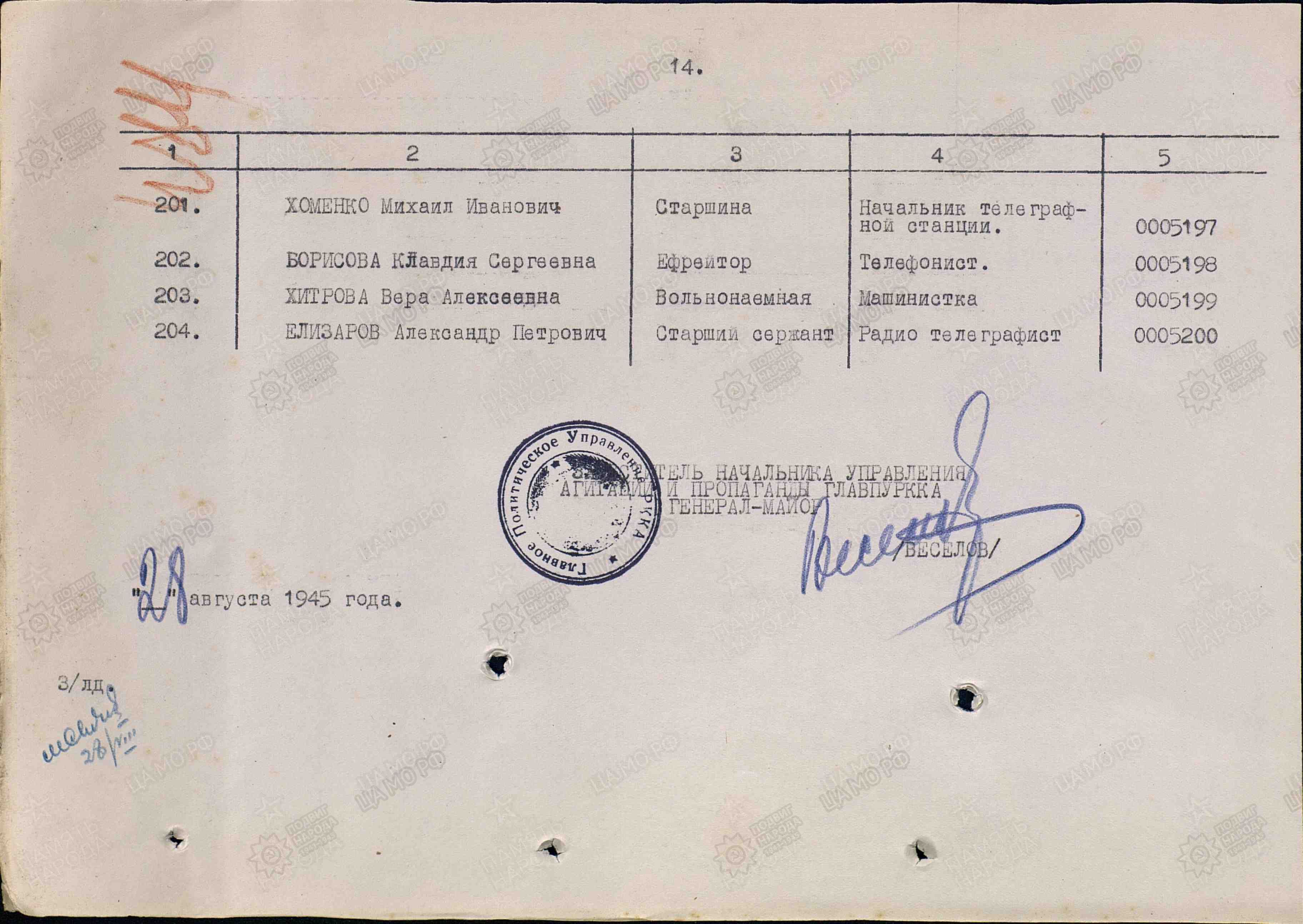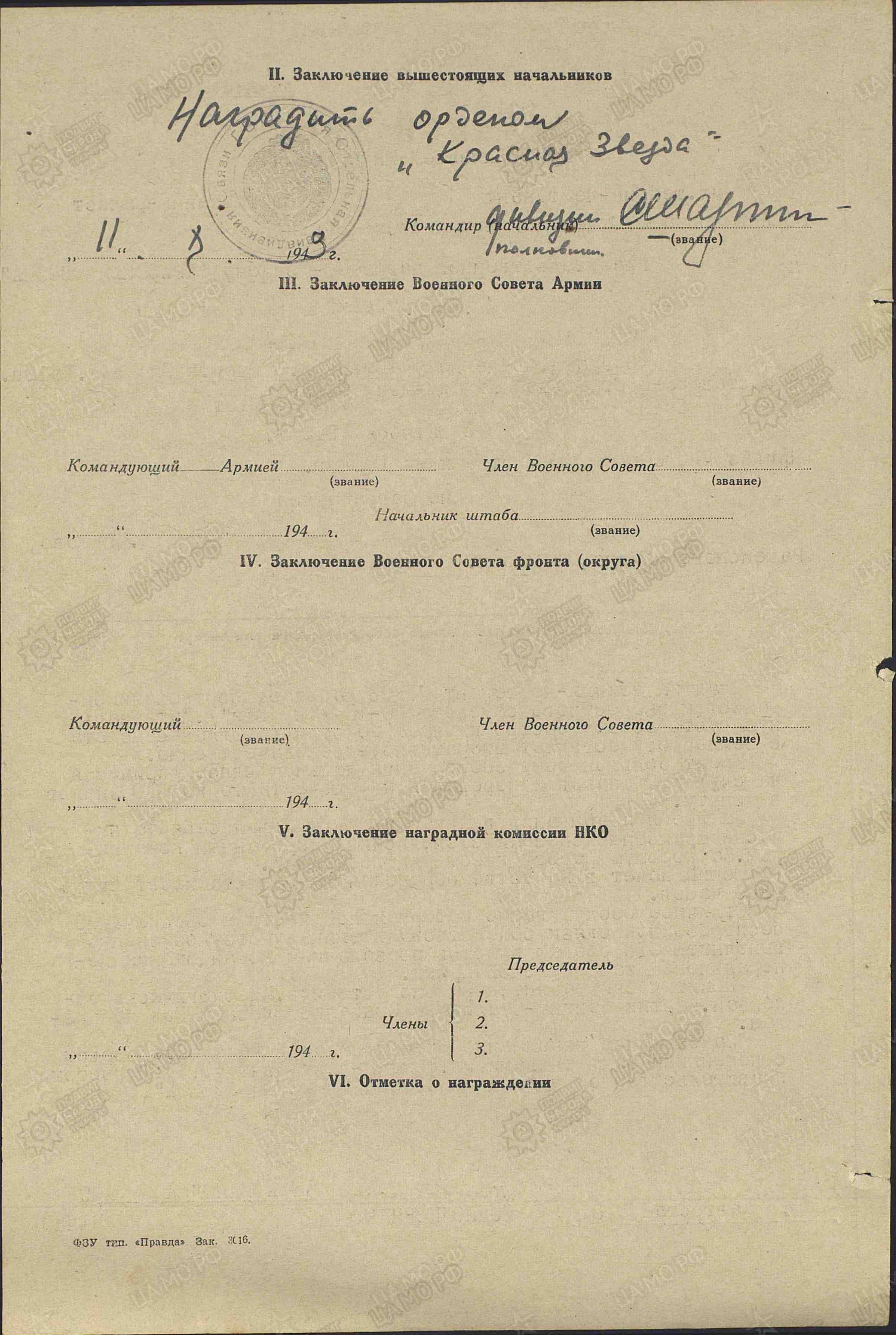 Акт от 17.08.1945 г. Издан Упр. агитации и пропаганды ГлавПУ РККА.// ЦАМО РФ. Ф. 33. Оп. 44677. Ед. хр. 570. № записи 1535711271 - http://podvignaroda.ru/?#id=1535711310& ... ilManAward