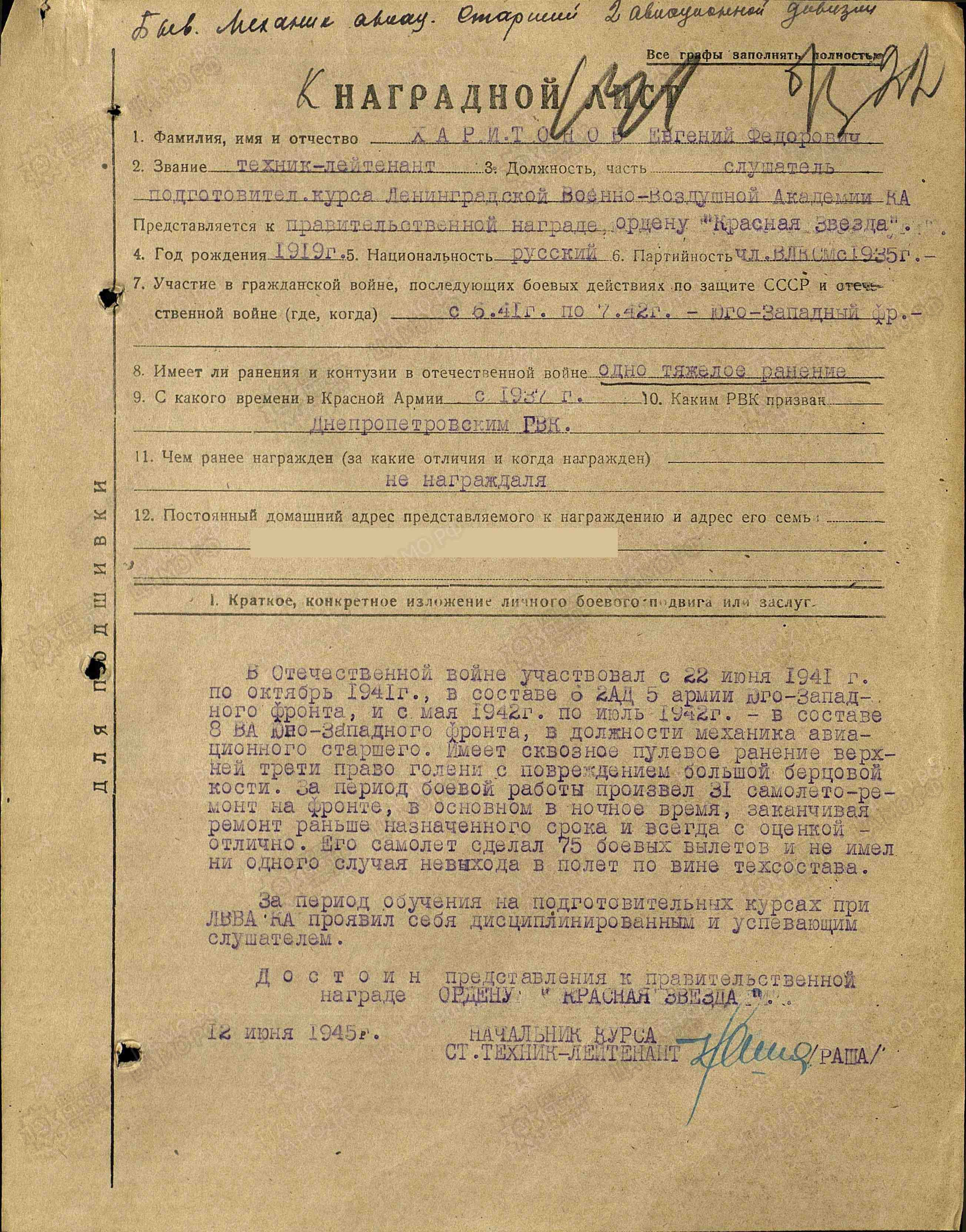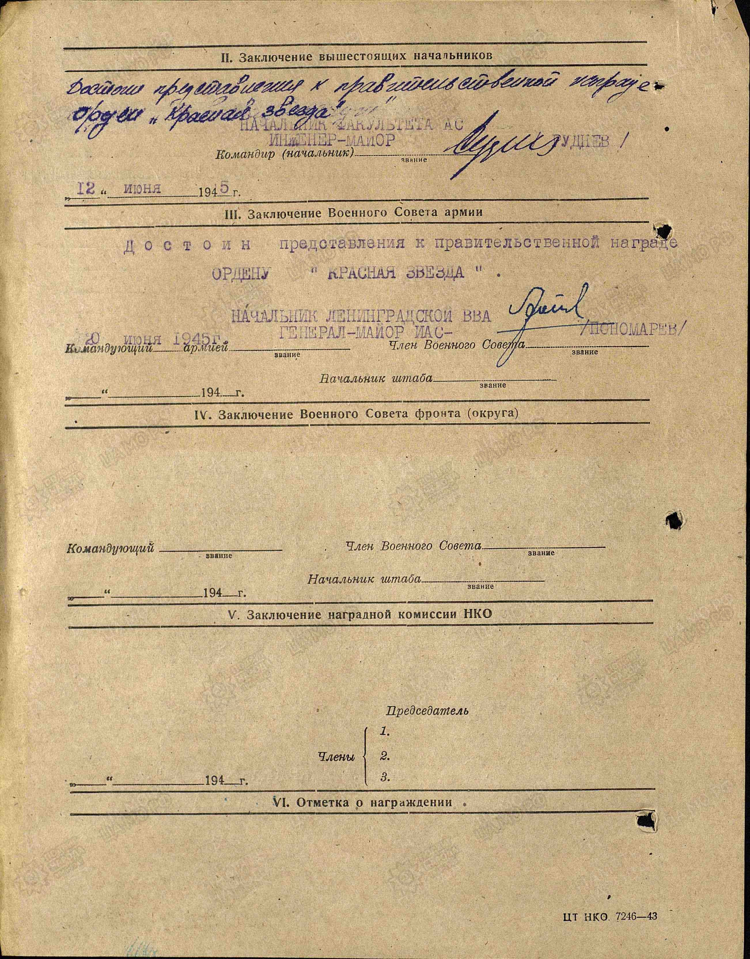 Наградной лист: Архив ЦВМА фонд 3 опись 1 единица хранения 719