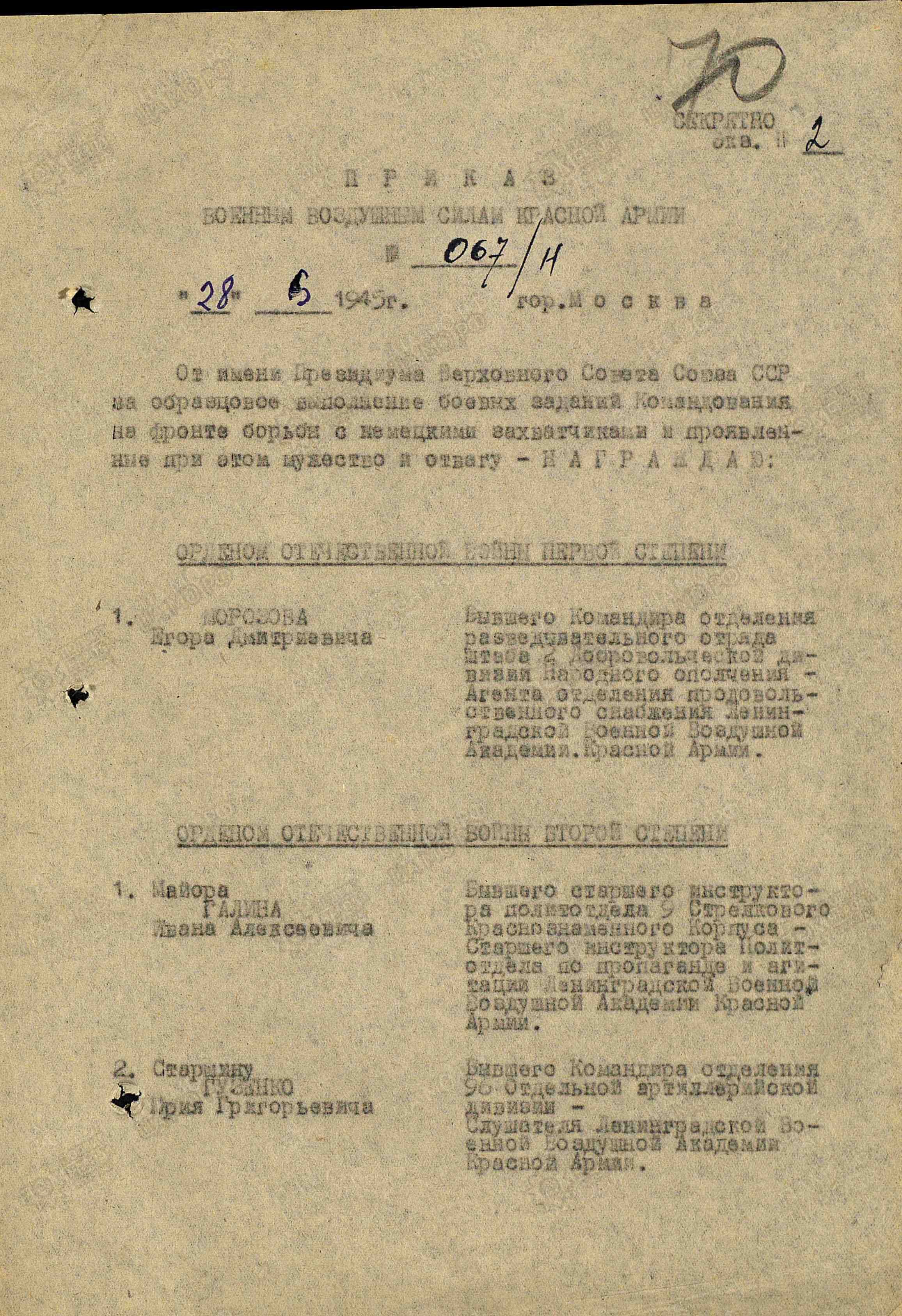 Фронтовой приказ от 28.06.1945 г. №: 67/н. Издан ВВС// ЦАМО РФ. Ф. 33. Оп. 686196. Ед. хр. 523. № записи 22667438 - http://podvignaroda.ru/?#id=22667438&ta ... ilDocument