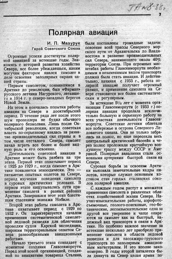 Статья И.П. Мазурука из журнала "Гражданская авиация " № 8, 1938 г.