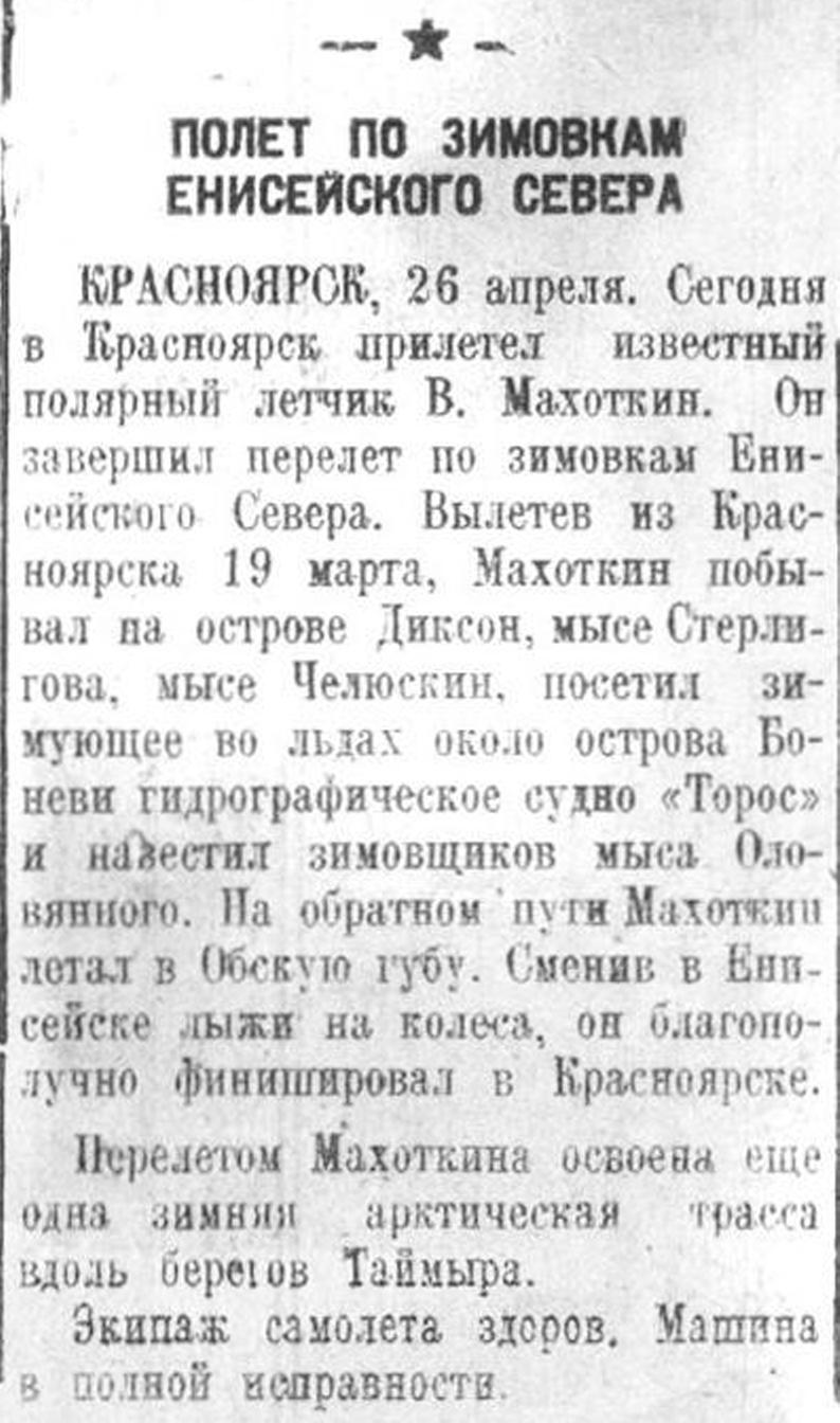 КРАСНОЯРСК., 26 апреля. Сегодня в Красноярск прилетел известный полярный летчик В. Махоткин. Он завершил перелет по зимовкам Енисейского Севера. Вылетев из Красноярска 19 марта, Махоткин побывал на острове Диксон, мысе Стерлегова. мысе Челюскин, посетил зимующее во льдах около острова Боневи гидрографическое судно «Торос» и навестил зимовщиков мыса Оловянного. На обратном пути Махоткин летал в Обскую губу. Сменив в Енисейске лыжи на колеса, он благополучно финишировал в Красноярске.