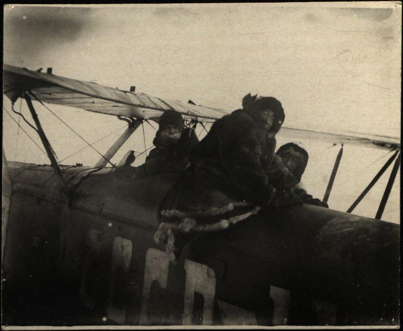 8 августа с.г. пилот Чукотского авио-отряда т. КАТЮХОВ и бортмеханик БЕРЕНДЕЕВ, на самолёте П-5 Н-42, пилот СУРГУЧЁВ и штурман МОХОВ на самолёте П-5 Н-46 взлетели с м. Шмидта в б.Оловянную, откуда срочно перебросить на самолётах рудоразработку в долину Амгуемы, к месту работ экспедиции Горно-Геологического Управления ГСМП.