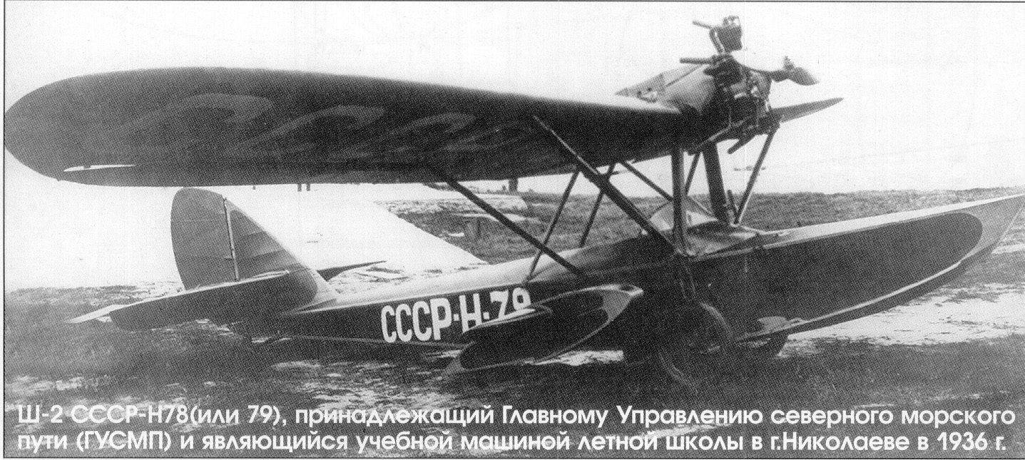 ... 10 самолетов Ш-2 были приписаны к Николаевской школе морских летчиков. Эти самолеты имели бортовые номера ГУСМП (СССР-Н-72 – СССР-Н-81) и были окрашены в классические цвета полярной авиации – ярко-синий и оранжевый. Машины использовались не только для подготовки летчиков, но и посылались в экспедиции.