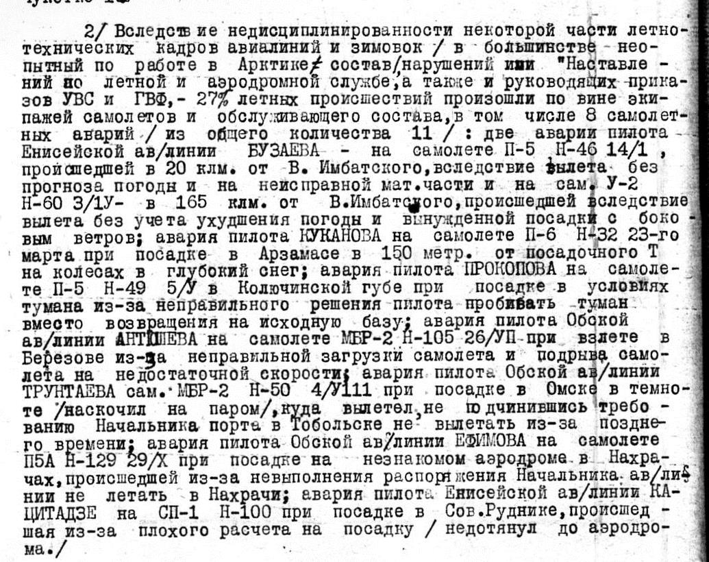 26.7 с.г. пилот Обской АЛ т. Антюшев следовал на МП-1 СССР Н-105 рейсом Оленёк-Обдорск. В а/п Берёзово … с-т при взлёте имел явно неправильное размещение груза … пилот подорвал с-т на недостаточной скорости (110 км/час), в результате потерял управляемость, с-т пошёл на нос и ударился плоскостями об воду, пробил днище и потерпел аварию. С-т разбит на 80%, 3 пассажира и б/м – ушибы. …