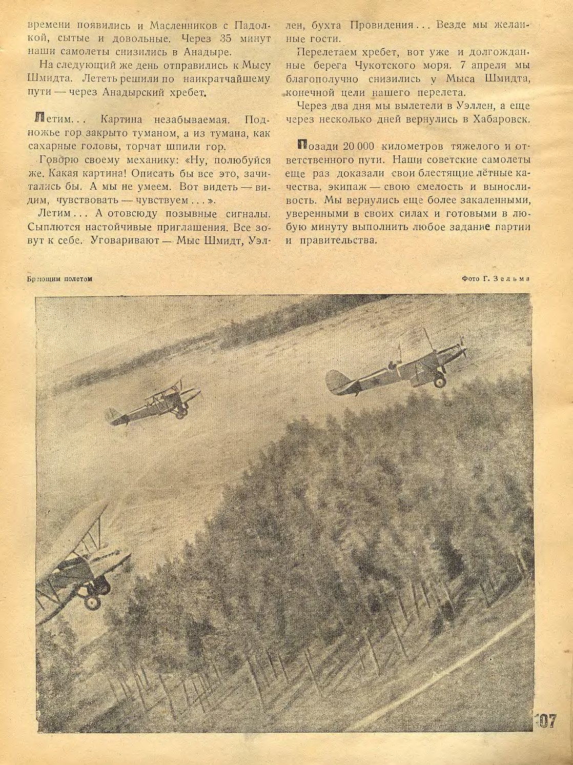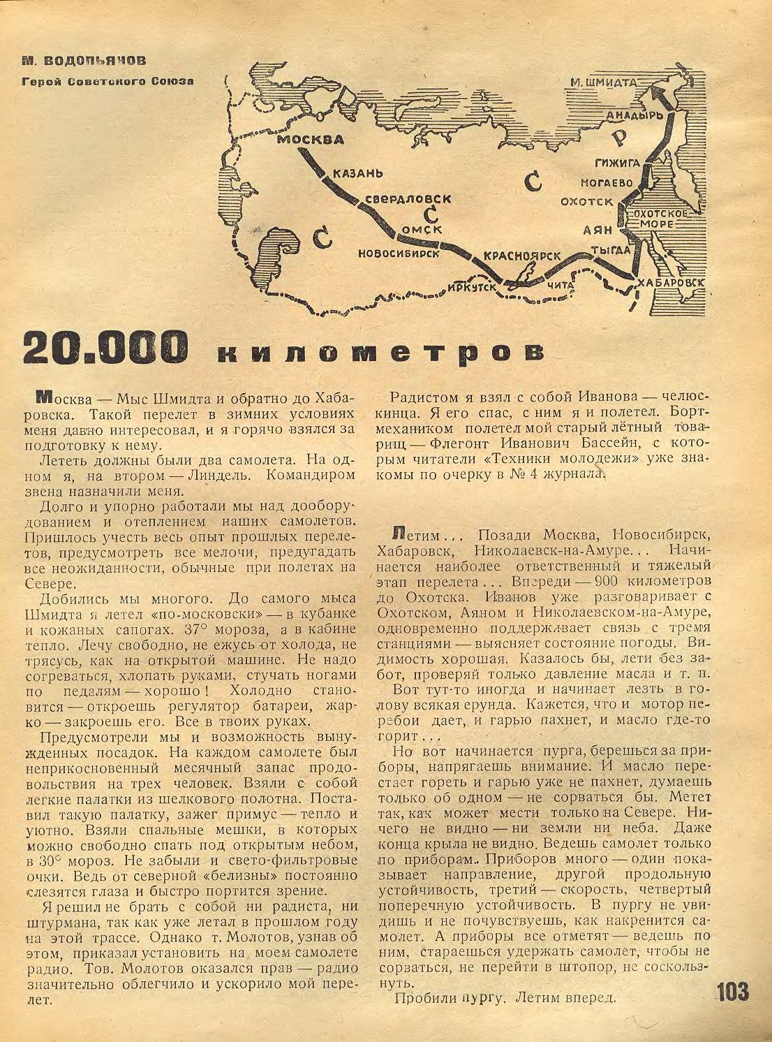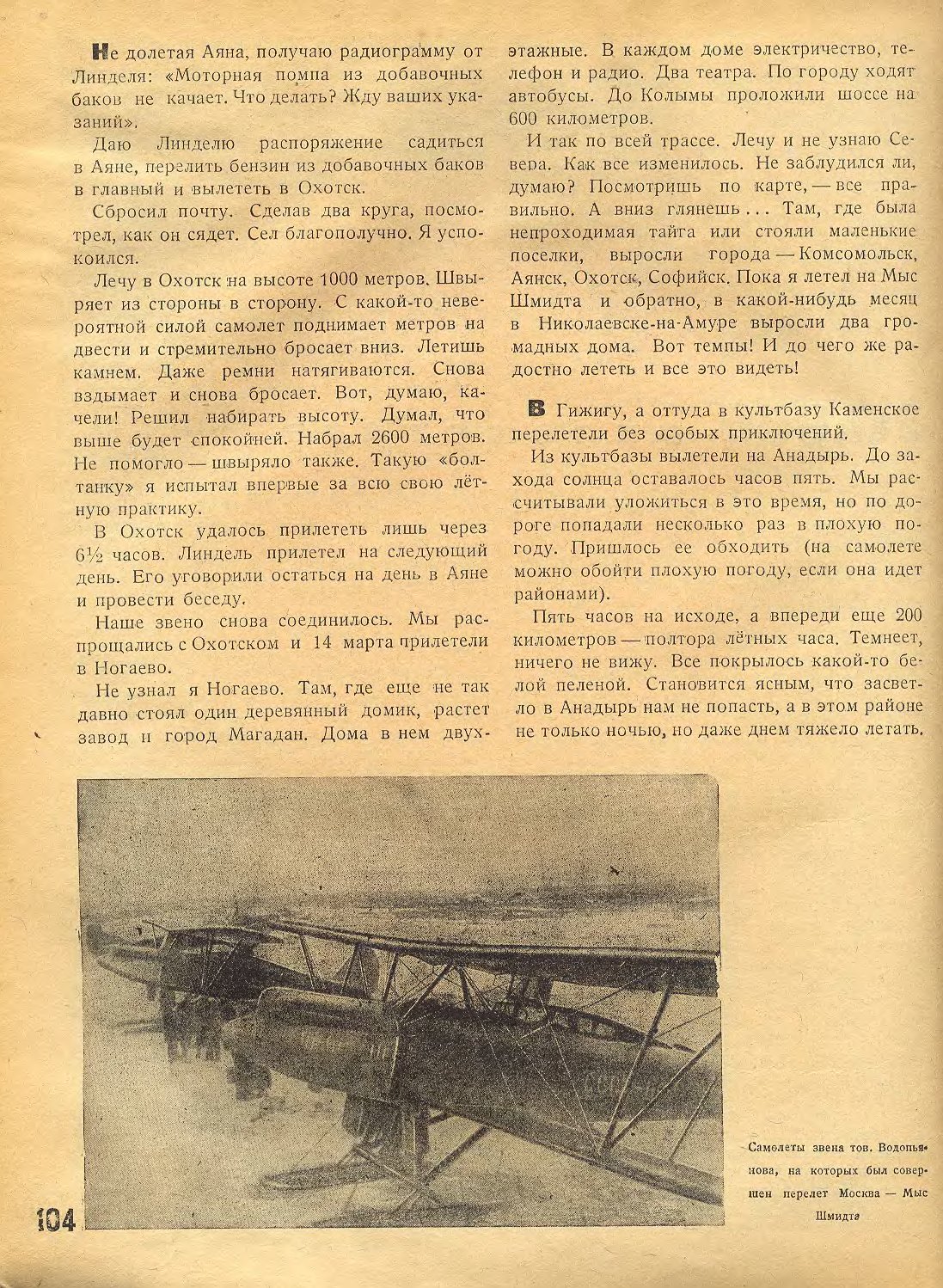 Другим важнейшим перелетом явится перелет героя Советского Союза т. Водопьянова. Во главе звена самолетов "П-5" он вылетит 10—15 февраля по маршруту Москва — Хабаровск — Нагаево — Анадырь — мыс Шмидта и обратно. Самолеты звена тов. Водопьянова утеплены и переделаны согласно его указаниям. Один из них будет иметь радиостанцию. Задачей этого перелета также является доставка почты и служебных грузов для полярных станций Севморпути и национального чукотского окружного исполнительного комитета и окружкома партии. Маршрут осложняется перелетом через Пенжинский залив от Нагаево до берегов Камчатки. Самолетам, снабженным лыжами, придется лететь над водой и дрейфующими льдами.