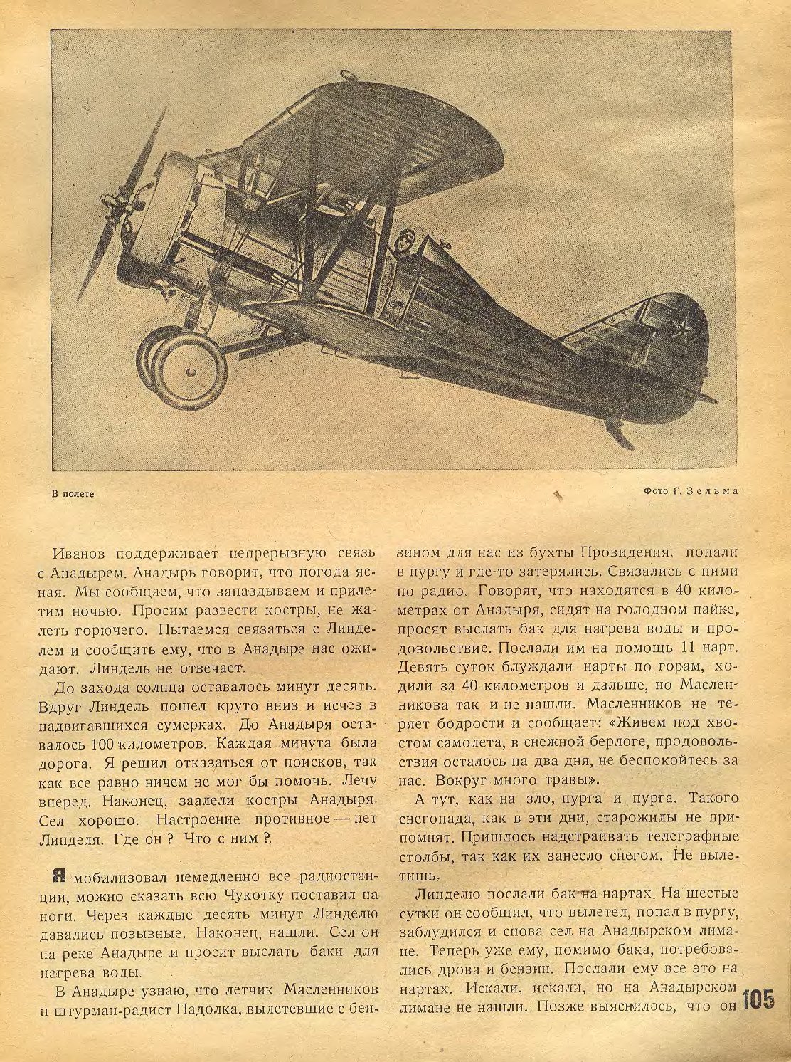 До захода солнца оставалось минут десять. Вдруг Линдель пошел круто вниз и исчез в надвигавшихся сумерках. До Анадыря оставалось 100 километров. Каждая минута была дорога. Я решил отказаться от поисков, так как вес равно ничем не мог бы помочь. Лечу вперед. Наконец, заалели костры Анадыря Сел хорошо. Настроение противное — нет Линдедя. Где он? Что с ним?