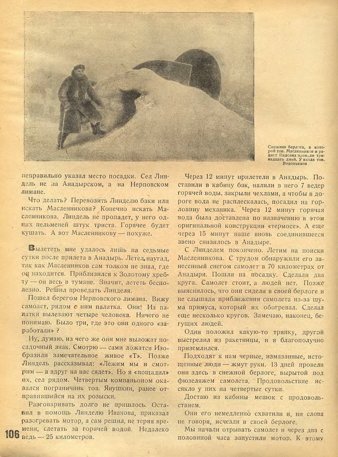 С Линделем покончено. Летим на поиски Масленникова. С трудом обнаружили его занесенный снегом самолет в 70 километрах от Анадыря. Пошли на посадку. Сделали два круга. Самолет стоит, а людей нет. Позже выяснилось, что они сидели в своей берлоге и не слышали приближения самолета из-за шума примуса, который их обогревал. Сделал еще несколько кругов. Замечаю, наконец, бегущих людей.