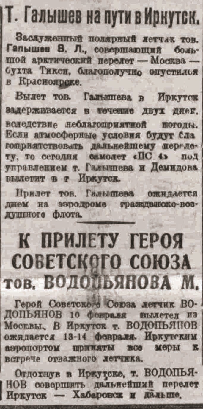 Герой Советской Союза летчик ВОДОПЬЯНОВ 10 февраля вылетел из Москвы. В Иркутск т. ВОДОПЬЯНОВ ожидается 13-14 февраля. Иркутским аэропортом приняты все меры к встрече отважного летчика.
