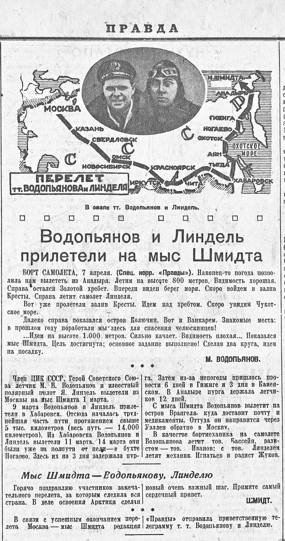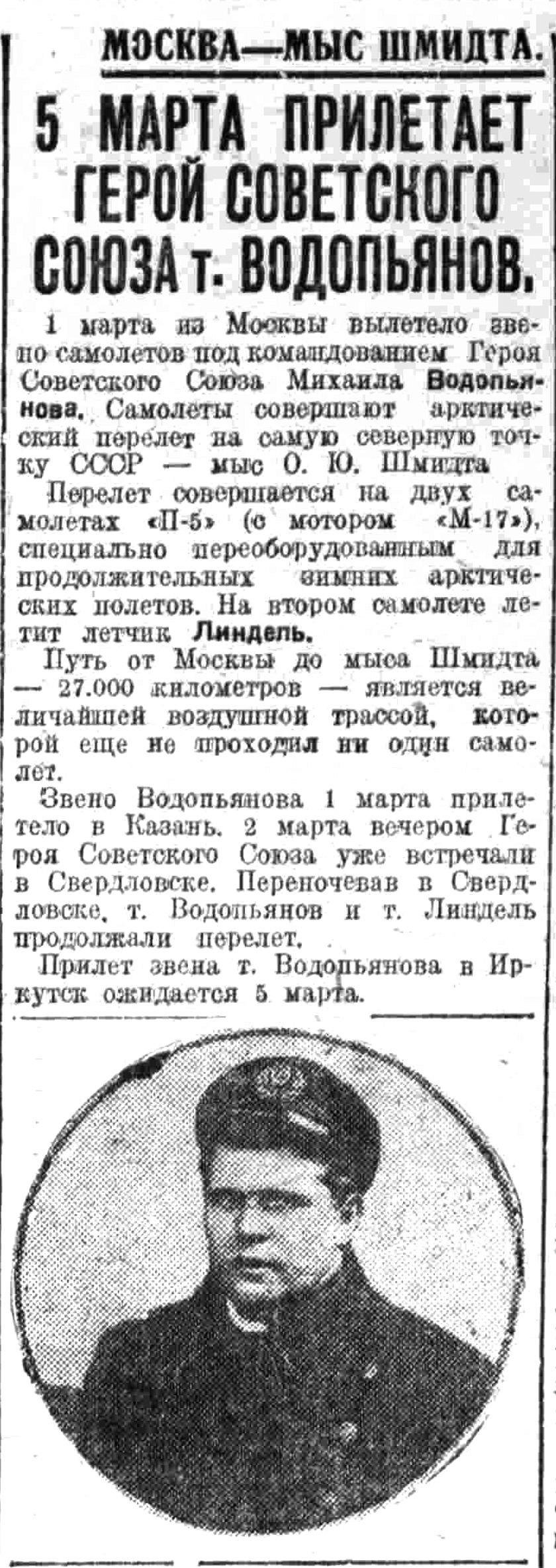 1 марта из Москвы вылетело звено самолетов под командованием Героя Советского Союза Михаила Водопьянова. Самолеты совершают арктический перелет на самую северную точку CCСP — мыс О. Ю. Шмидта Перелет совершается ка двух самолетах "П-5" (с мотором «М-17»), специально переоборудованным для продолжительных зимних арктических полетов. На втором самолете летит летчик Линдель.