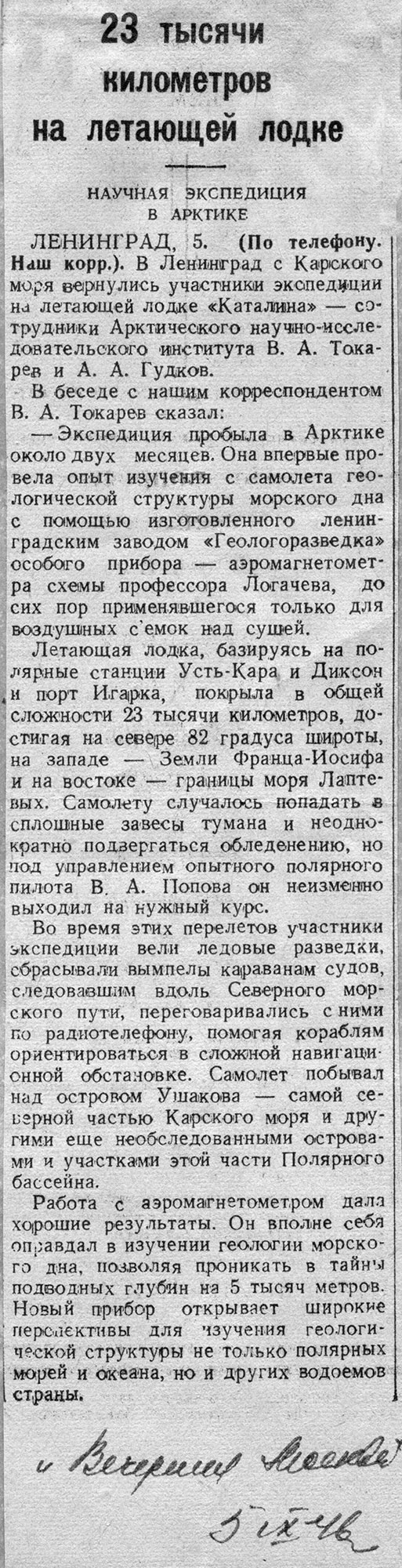В Ленинград с Карского моря вернулись участники экспедиции на летающей лодке «Каталина» — сотрудники Арктического научно-исследовательского 'института В. А. Токарев и А. А. Гудков.