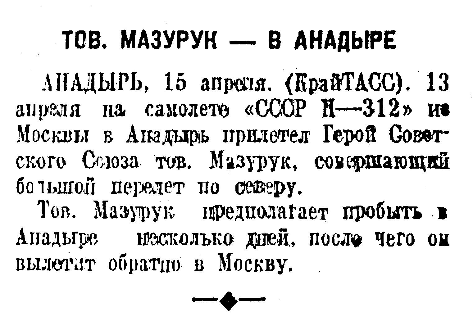 АНАДЫРЬ, 15 апреля. (КрайТАСС). 13 апреля на самолета «ССCР Н—312» из Москвы в Анадырь прилетел Герой Советского Союза тов. Мазурук, совершающий большой перелет по северу.