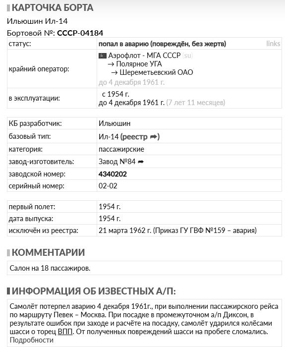 Пока тема "СССР-04184" неактивна. Ещё одна вынужденная, аварийная посадка с этим самолётом в 1964 г. в районе 74-й параллели с магнитной аномалией. Причина - вышли из строя генераторы, сели, не выдержав нагрузки, аккумуляторы. Прекратилась радиосвязь с землей. Началось обледенение двигателей и самолёта. В итоге были спасены 18 пассажиров.