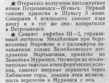 Воздушный транспорт должен сыграть выдающуюся роль в деле социалистической реконструкции Карельской АССР и Ленинградской области. Наряду с первой регулярно работающей воздушной линией Ленинград—Петрозаводск во вторую пятилетку предполагается установить следующие линии „Трансавиации".