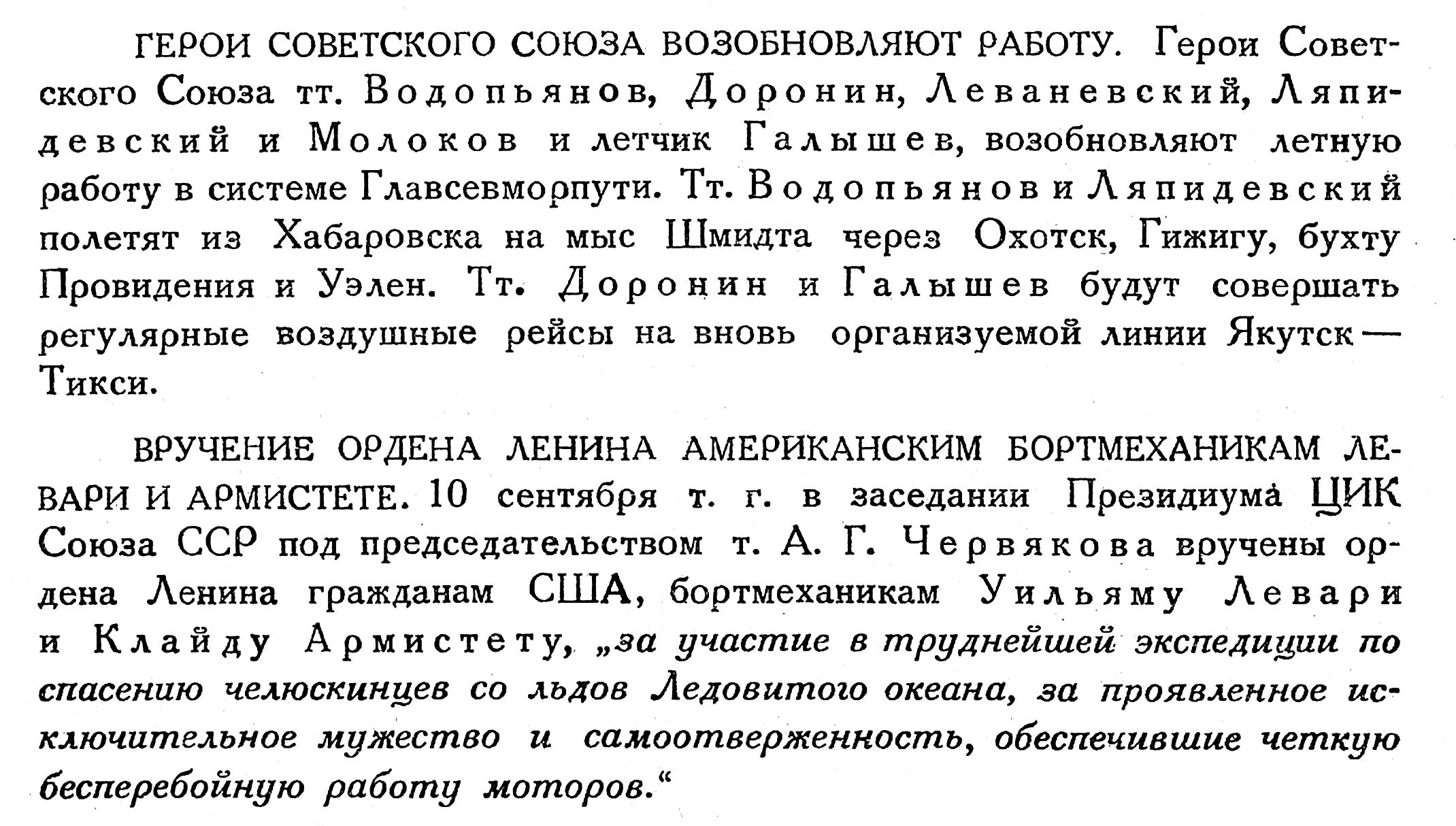 ГЕРОИ СОВЕТСКОГО СОЮЗА ВОЗОБНОВЛЯЮТ РАБОТУ. Герои Советского Союза тт. Водопьянов, Доронин, Леваневский, Ляпидевский и Молоков и летчик Галышев, возобновляют летную работу в системе Главсевморпути. Тт. Водопьянов и Ляпидевский полетят из Хабаровска на мыс Шмидта через Охотск, Гижигу, бухту Провидения и Уэлен. Тт. Доронин и Галышев будут совершать регулярные воздушные рейсы на вновь организуемой линии Якутск — Тикси.