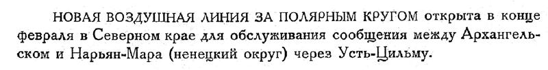 НОВАЯ ВОЗДУШНАЯ ЛИНИЯ ЗА ПОЛЯРНЫМ КРУГОМ открыта в конце февраля в Северном крае для обслуживания сообщения между Архангельском и Нарьян-Мара (ненецкий округ) через Усть-Цильму.