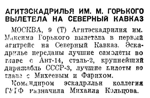 МОСКВА, 9 (Т) Агитэскадрилия им. Максима Горького вылетела в первый агитрейс на Северный Кавказ. Эскадрилье переданы лучшие самолеты во главе с Ант-14, сталь-2, крупнейший дирижабль СССР-3, лучшие пилоты во главе с Михеевым и Фарихом.